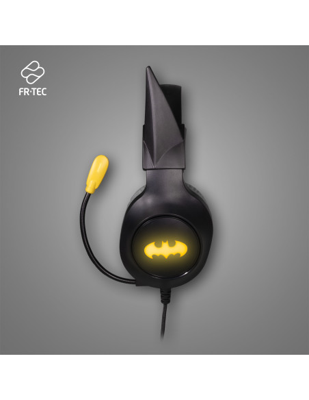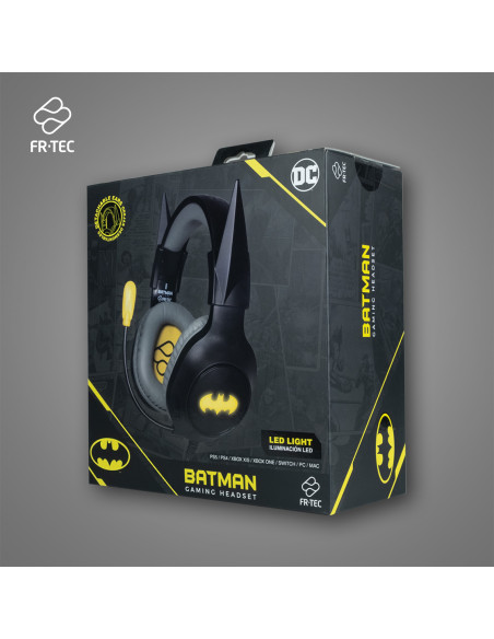 Los auriculares gaming de Batman™ por FR-TEC son únicos para fans del Caballero Oscuro que además usan auriculares durante largas sesiones de juego. Con un altavoz de 50mm y sonido estéreo, están especialmente diseñados para tener cancelación de ruido y aumentar su calidad de sonido. Cuentan con unas divertidas orejas de Batman™ en los laterales que pueden ser extraídas con facilidad. El micrófono es flexible para adaptarlo a la altura de cada usuario y en los laterales, se ilumina un flamante logo de Batman™ mediante la luz LED amarilla. Licencia oficial Batman™ Orejas extraibles incorporadas Altavoz de 50mm Plataformas principales Multiplataforma