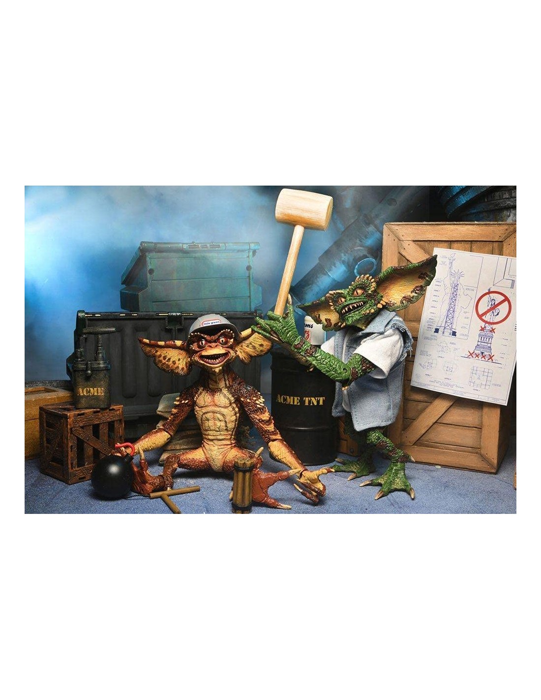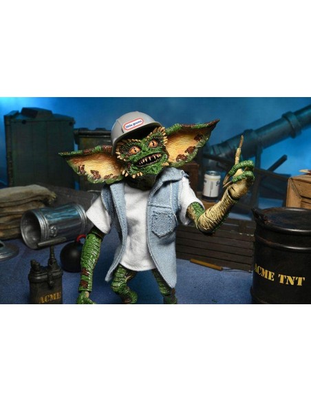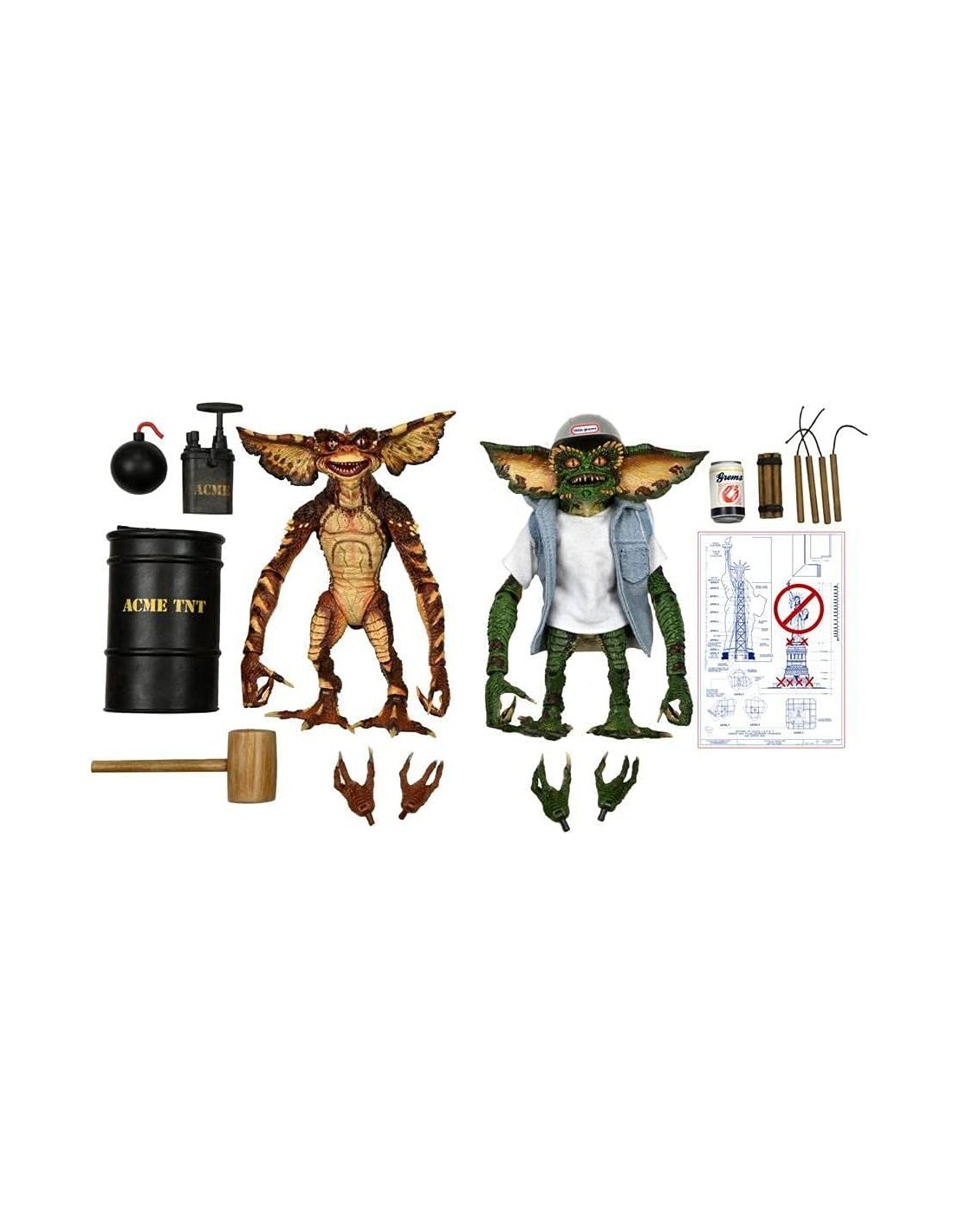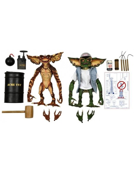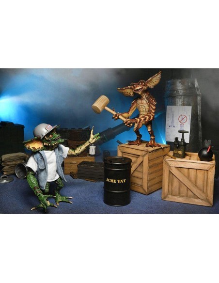 NECA presenta esta set de 2 figuras Ultimate Demolition Gremlin, dentro de su linea Ultimate, basadas en los personajes de Gremlins 2. las figuras del set miden unos 18 cm y se incluye barril, mazo, bomba, lata, dinamita, émbolo de dinamita, manos intercambiables, casco, camiseta de tela y chaleco vaquero. y 1x chaleco vaquero."