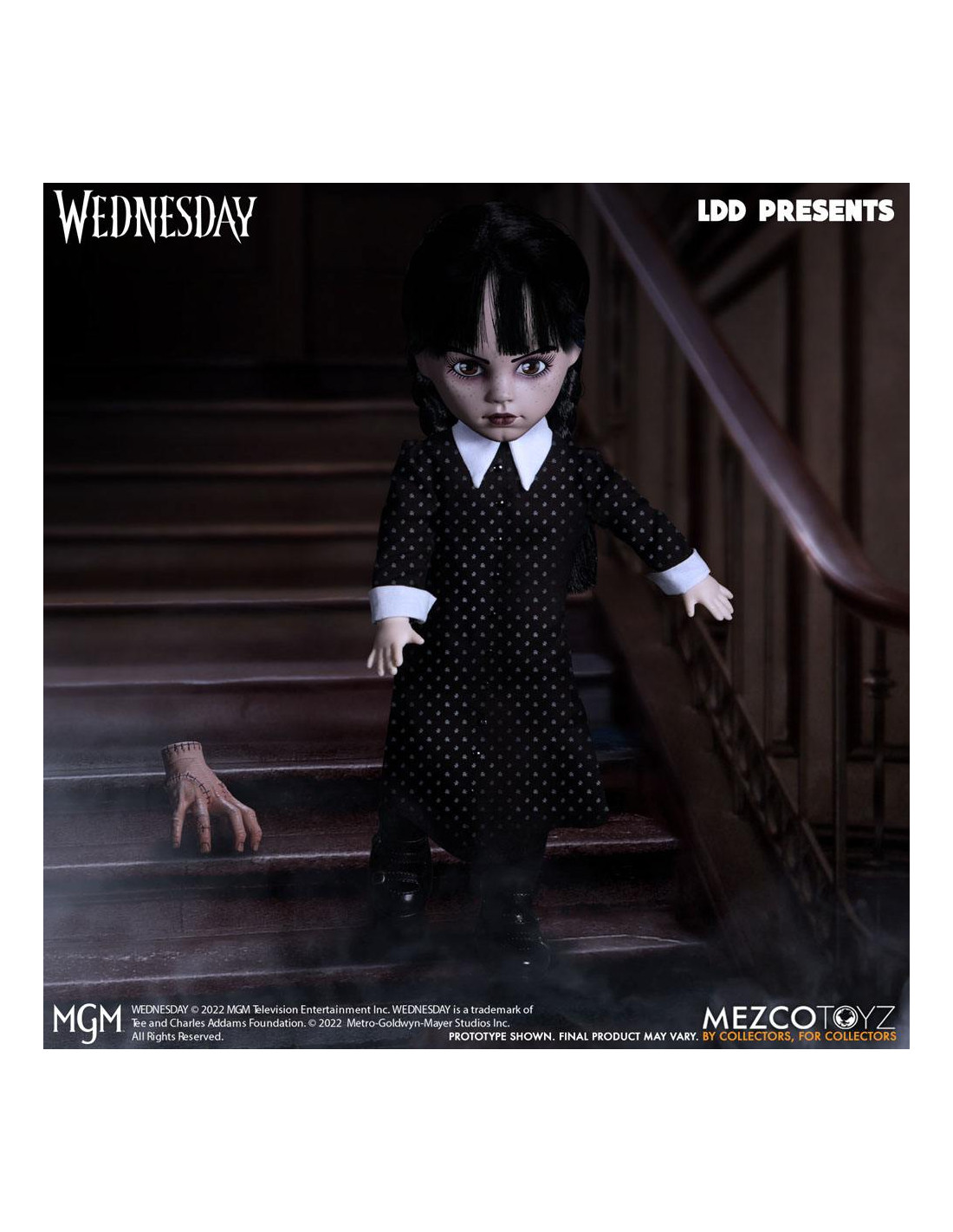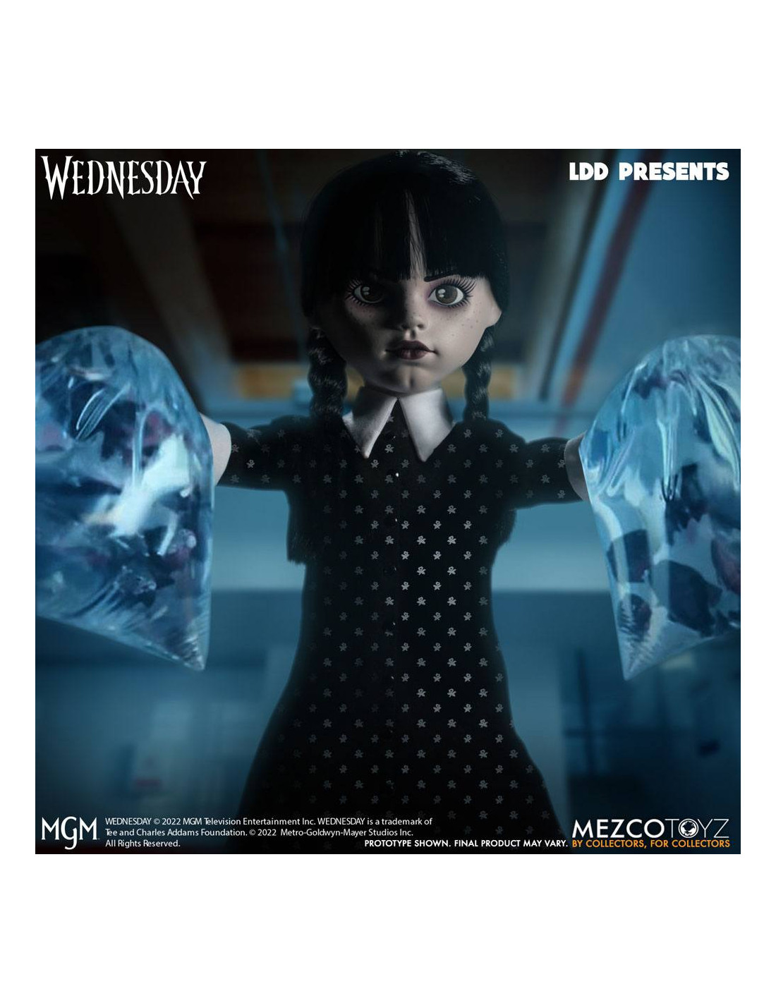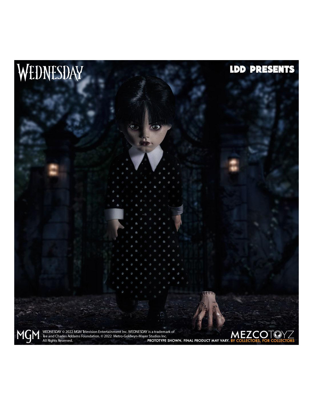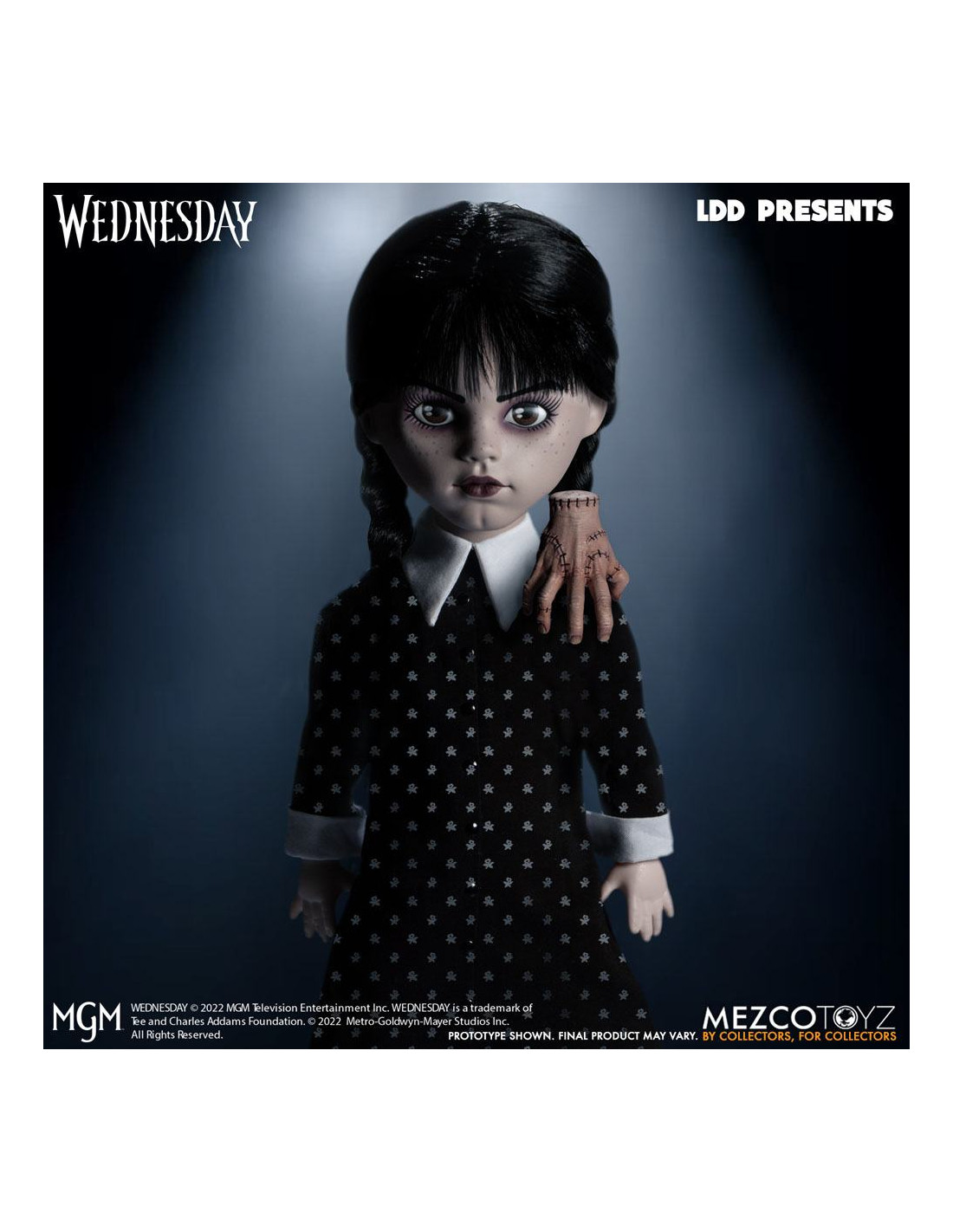 Mezco Toyz vuelve a presentar, dentro de la colección LDD (Living Dead Dolls), la figura de Wednesday. Mikde 25 cm y está basada en su aparición en la serie de Netflix "Wednesday". Cuenta con 5 puntos de articulación y con su fiel sirviente Thing. Viene en una caja con ventana.