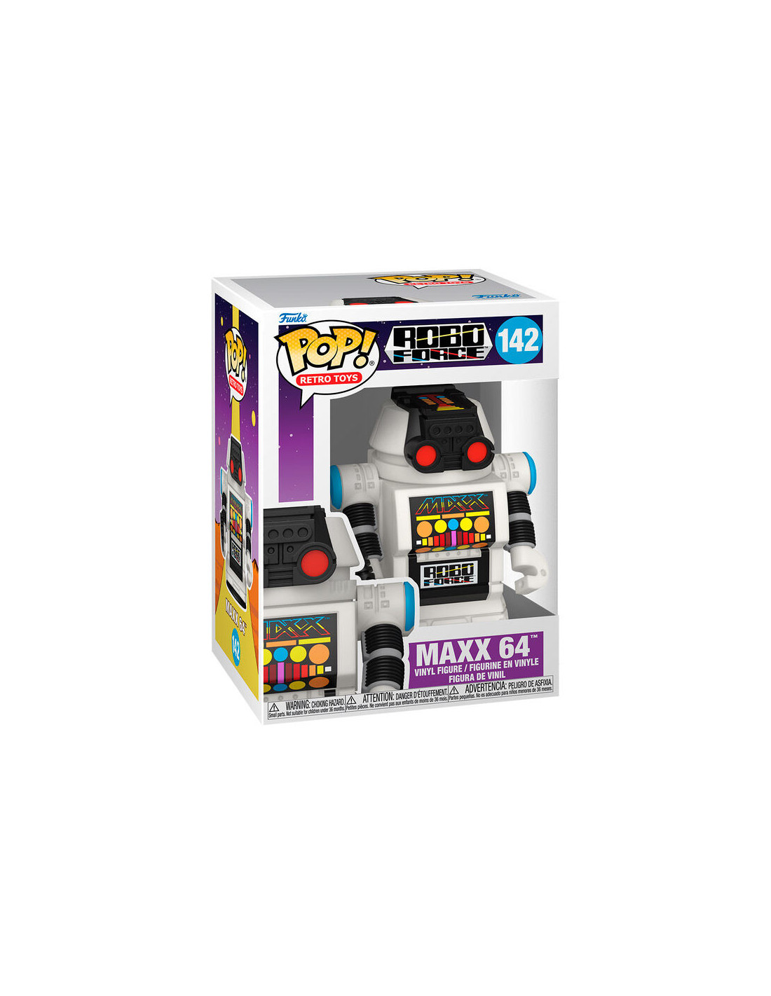 Retro Toys Robo Force MAXX 64 (142). Figura de colección de la marca Funko Pop! · Fabricada en vinilo y con una cabeza de tamaño desproporcionado como principal rasgo distintivo. · Mide unos 9cm. de altura aproximada. · Se entrega en una caja de cartón y plástico rígido transparente. · Con licencia oficial de RETRO TOYS.