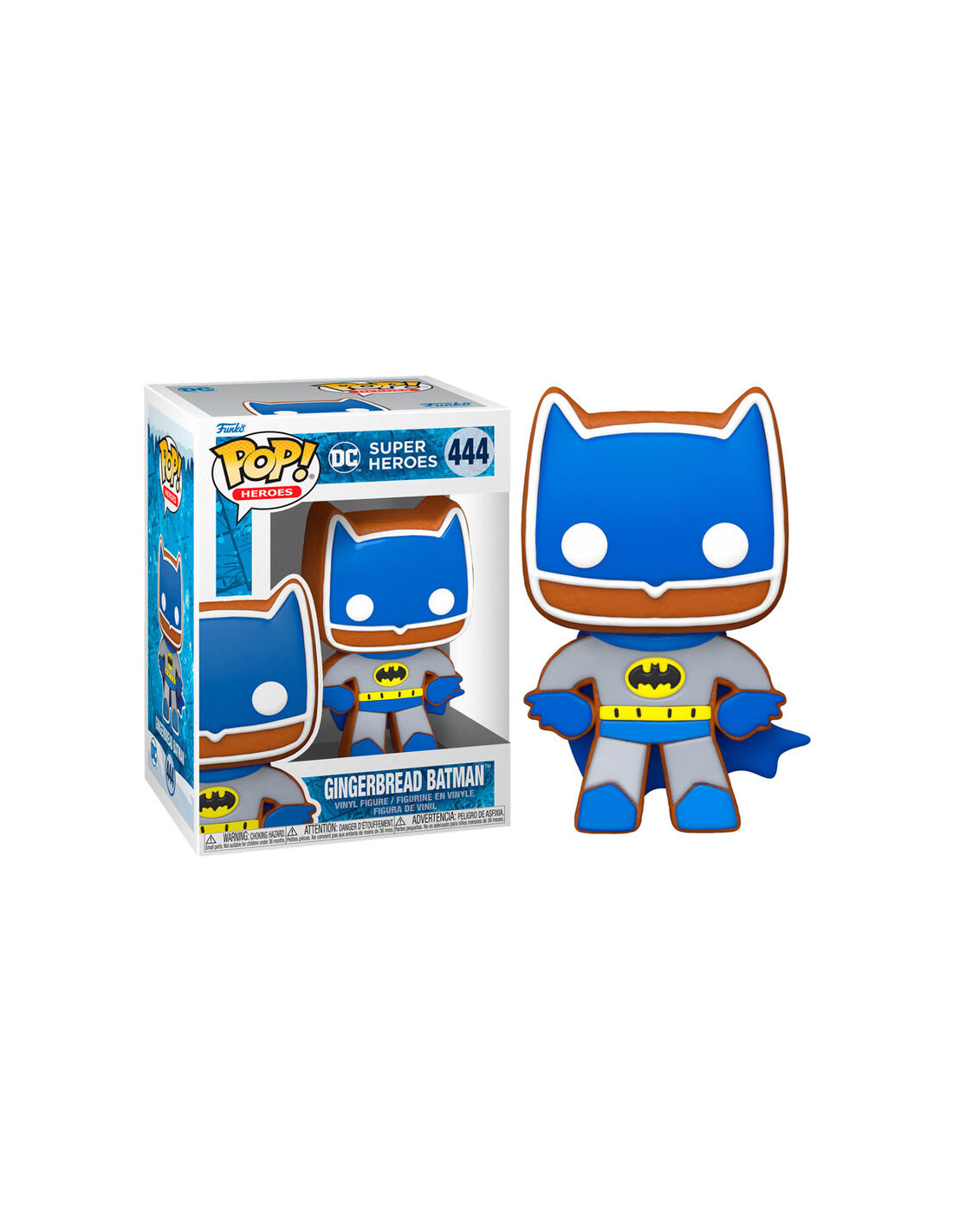 DC Super Heroes Holiday Gingerbread Batman (444). Figura de colección de la marca Funko Pop! · Fabricada en vinilo y con una cabeza de tamaño desproporcionado como principal rasgo distintivo. · Mide unos 9 cm. de altura aproximada. · Se entrega en una caja de cartón y plástico rígido transparente. · Con licencia oficial de DC.