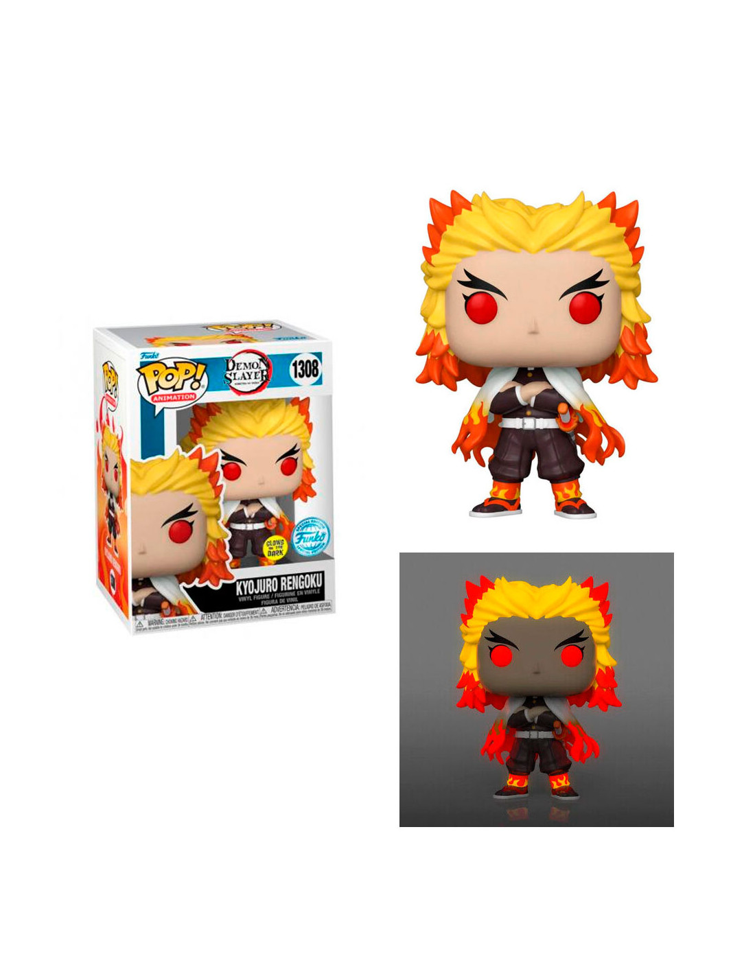 Demon Slayer Kyojuro Rengoku Glows in the Dark Special Edition (1308). Figura de colección de la marca Funko Pop! · Fabricada en vinilo y con una cabeza de tamaño desproporcionado como principal rasgo distintivo. · Mide unos 9 cm. de altura aproximada. · Se entrega en una caja de cartón y plástico rígido transparente. · Con licencia oficial de DEMON SLAYER.