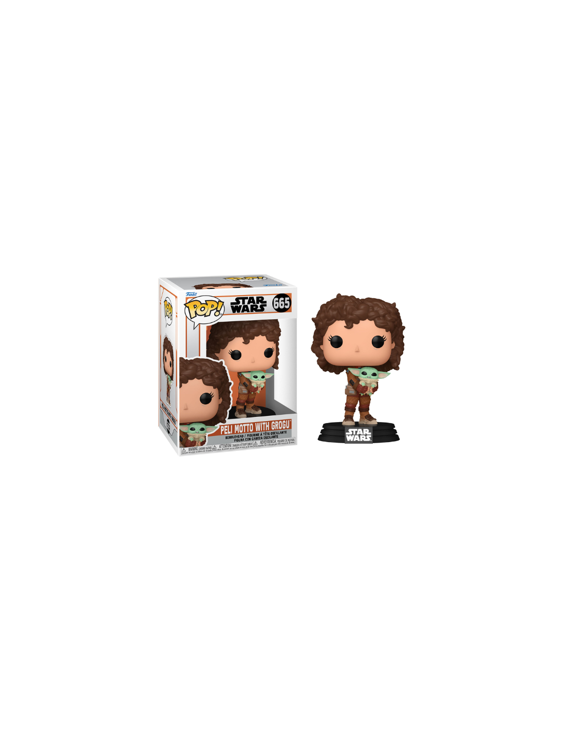 Star Wars Mandalorian Peli Motto with Grogu (665). Figura de colección de la marca Funko Pop! · Fabricada en vinilo y con una cabeza de tamaño desproporcionado como principal rasgo distintivo. · Mide unos 9cm. de altura aproximada. · Se entrega en una caja de cartón y plástico rígido transparente. · Con licencia oficial de Star Wars