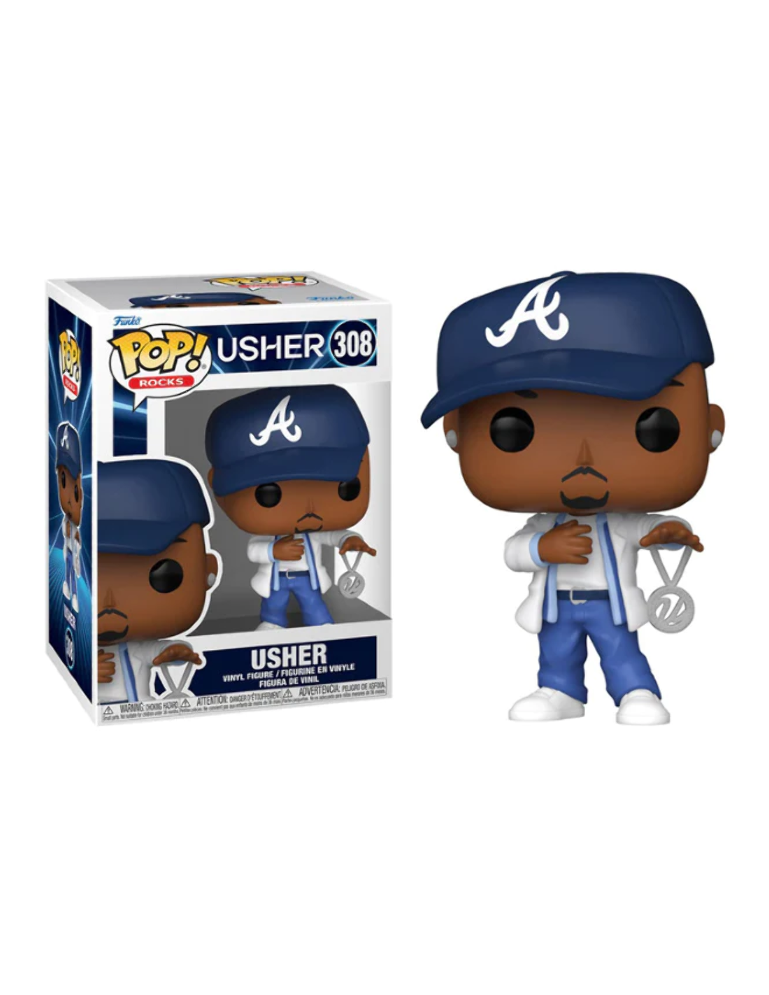 Usher (308). Figura de colección de la marca Funko Pop! · Fabricada en vinilo y con una cabeza de tamaño desproporcionado como principal rasgo distintivo. · Mide unos 9cm. de altura aproximada. · Se entrega en una caja de cartón y plástico rígido transparente. · Con licencia oficial de MUSIC/ROCKS.
