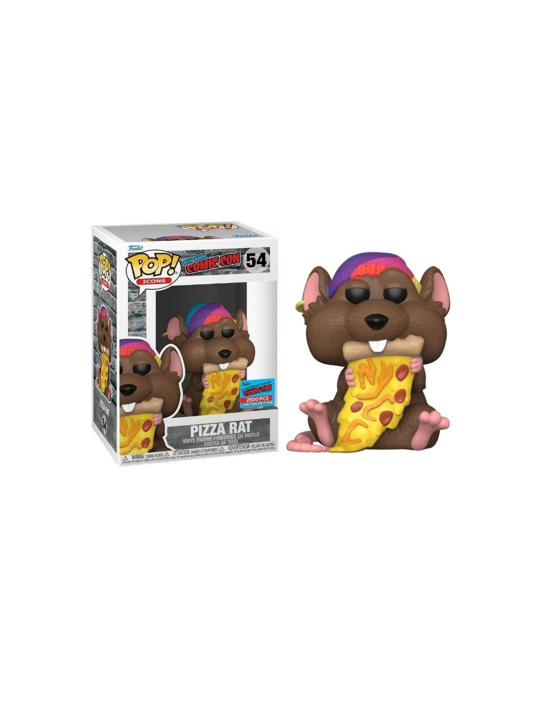 New York COMIC CON Pizza Rat (54). Figura de colección de la marca Funko Pop! · Fabricada en vinilo y con una cabeza de tamaño desproporcionado como principal rasgo distintivo. · Mide unos 9cm. de altura aproximada. · Se entrega en una caja de cartón y plástico rígido transparente. · Con licencia oficial de MUSIC/ROCKS.