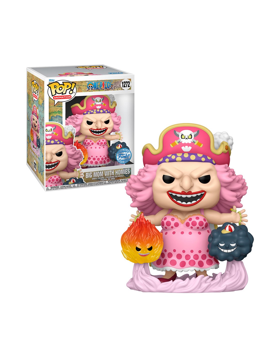 One Piece Big Mom with Homies Special Edition (1272). Figura de colección de la marca Funko Pop! · Fabricada en vinilo y con una cabeza de tamaño desproporcionado como principal rasgo distintivo. · Mide unos 15cm. de altura aproximada. · Se entrega en una caja de cartón y plástico rígido transparente. · Con licencia oficial de ONE PIECE.