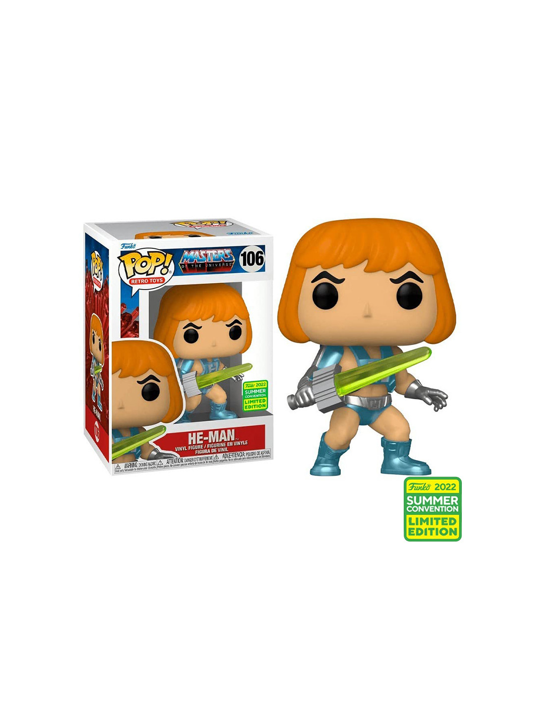 Master of the Universe He-Man Funko 2022 Summer Convention Limited Edition (106). Figura de colección de la marca Funko Pop! · Fabricada en vinilo y con una cabeza de tamaño desproporcionado como principal rasgo distintivo. · Mide unos 9 cm. de altura aproximada. · Se entrega en una caja de cartón y plástico rígido transparente. · Con licencia oficial de MASTER DEL UNIVERSO.