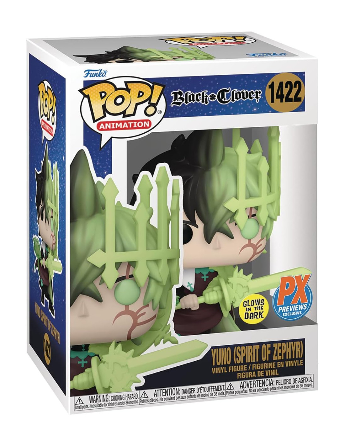 Black Clover Yuno (Spirit of Zephyr) Special Edition (1422). Figura de colección de la marca Funko Pop! · Fabricada en vinilo y con una cabeza de tamaño desproporcionado como principal rasgo distintivo. · Mide unos 9cm. de altura aproximada. · Se entrega en una caja de cartón y plástico rígido transparente. · Con licencia oficial de BLACK CLOVER.