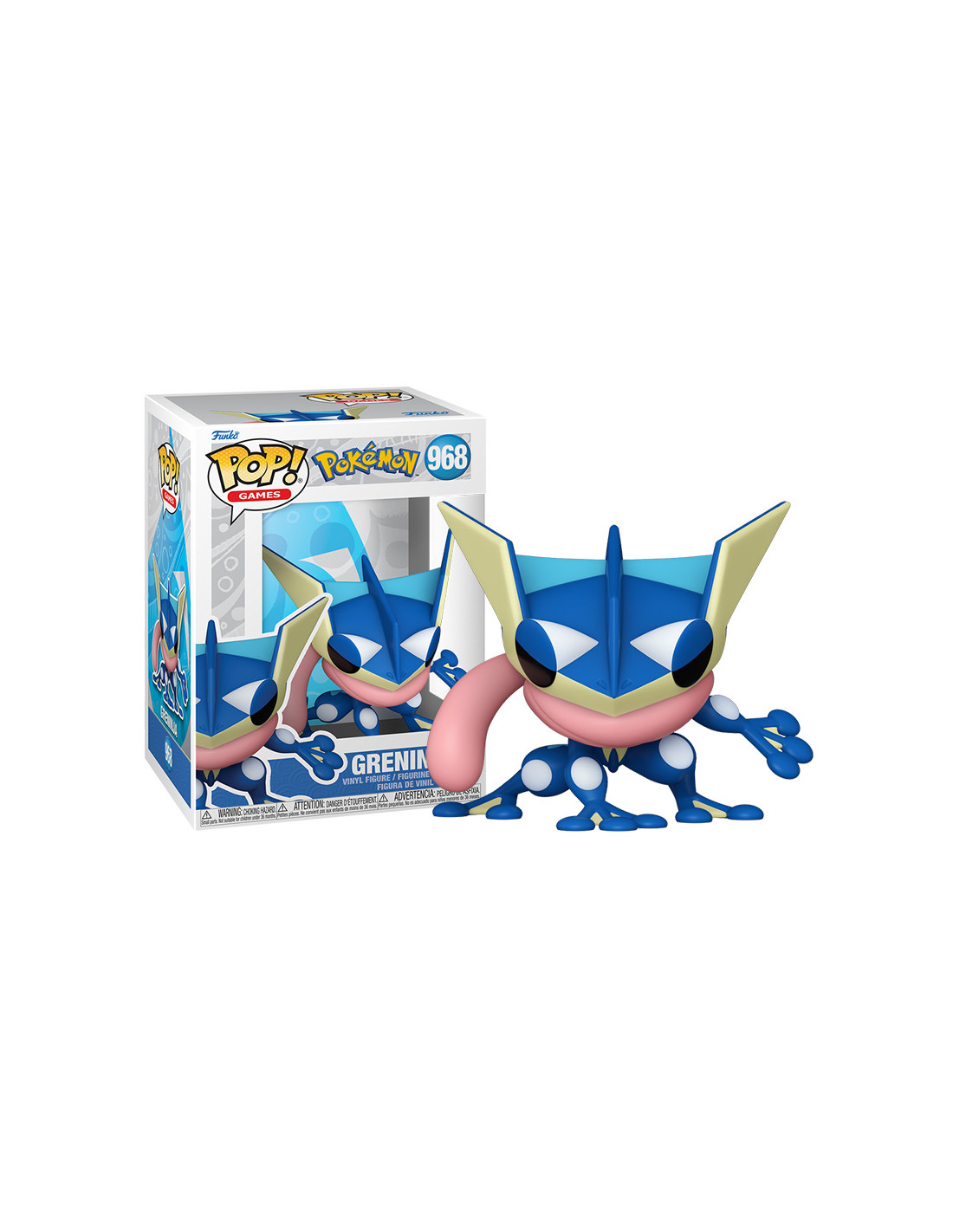 Pokémon Greninja (968). Figura de colección de la marca Funko Pop! · Fabricada en vinilo y con una cabeza de tamaño desproporcionado como principal rasgo distintivo. · Mide unos 9cm. de altura aproximada. · Se entrega en una caja de cartón y plástico rígido transparente. · Con licencia oficial de POKEMON.