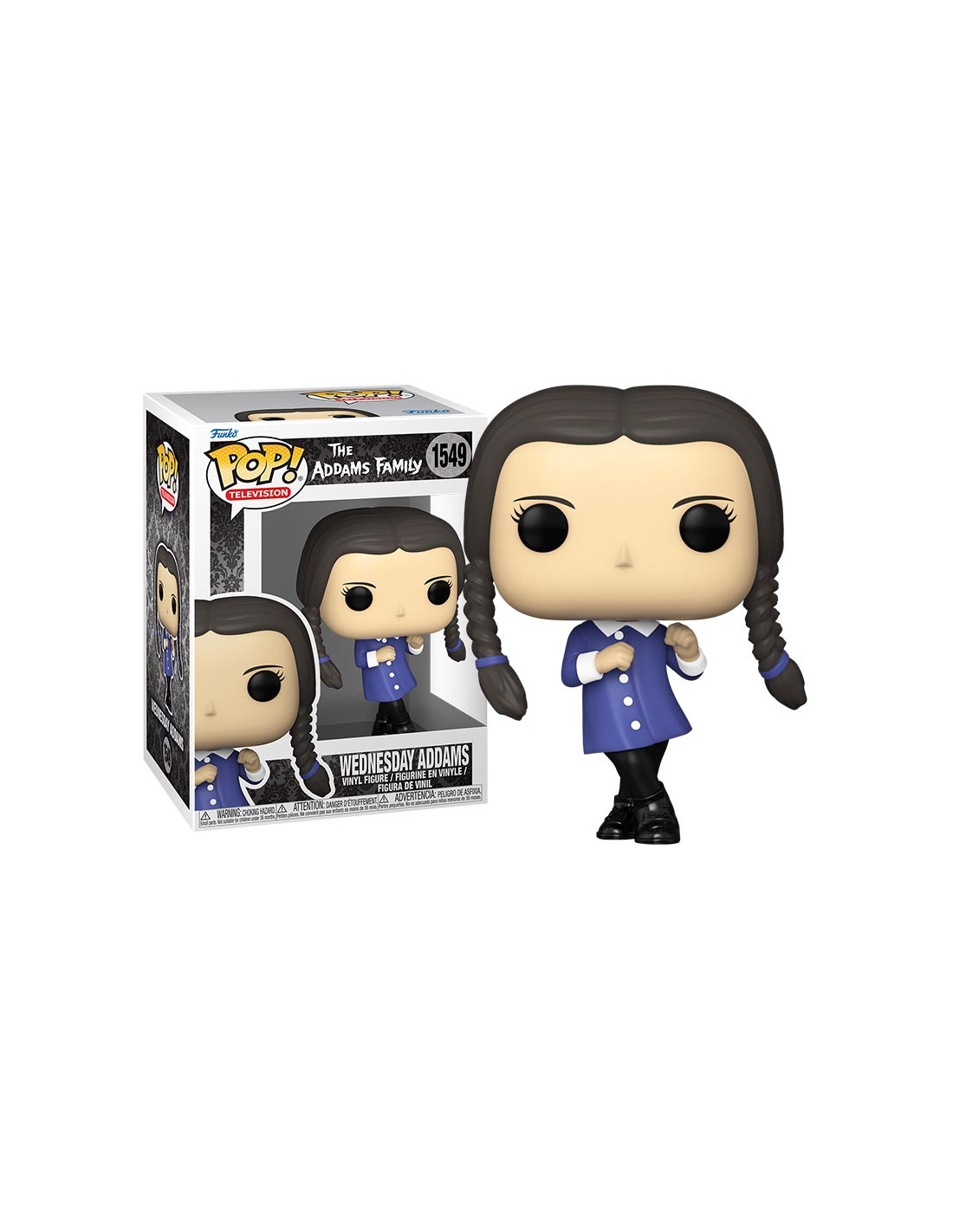 La Familia Addams Wednesday Addams (1549). Figura de colección de la marca Funko Pop! · Fabricada en vinilo y con una cabeza de tamaño desproporcionado como principal rasgo distintivo. · Mide unos 9 cm. de altura aproximada. · Se entrega en una caja de cartón y plástico rígido transparente. · Con licencia oficial de LA FAMILIA ADDAMS.