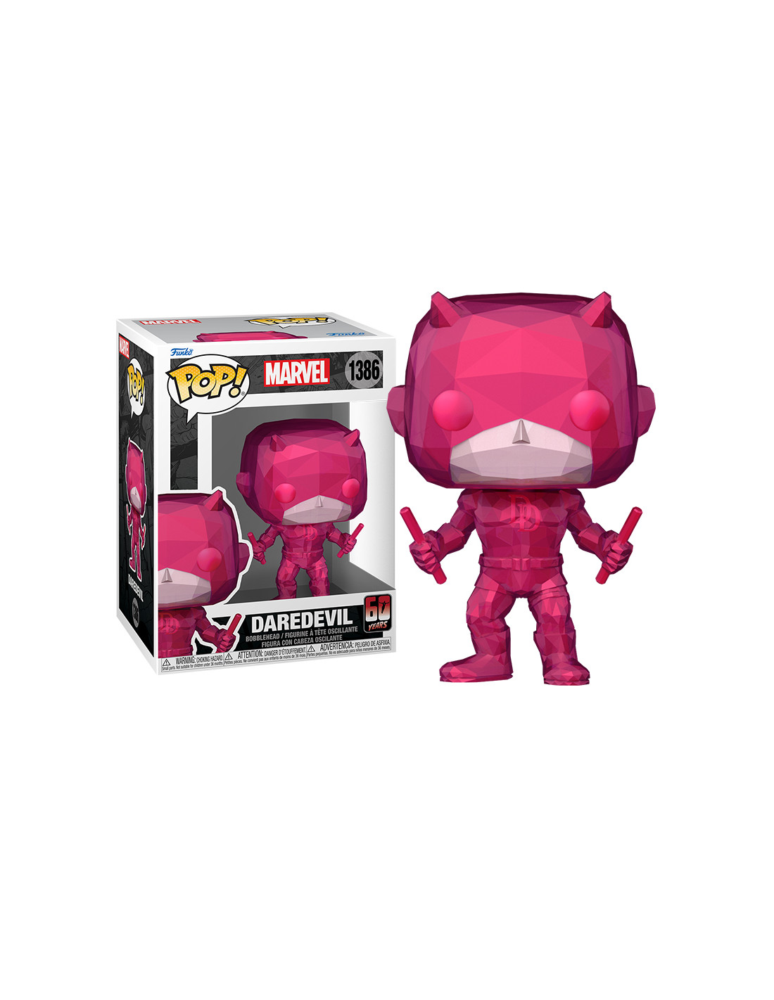 Marvel Daredevil (60Years Facet) (1386). Figura de colección de la marca Funko Pop! · Fabricada en vinilo y con una cabeza de tamaño desproporcionado como principal rasgo distintivo. · Mide unos 9 cm. de altura aproximada. · Se entrega en una caja de cartón y plástico rígido transparente. · Con licencia oficial de MARVEL DAREDEVIL.