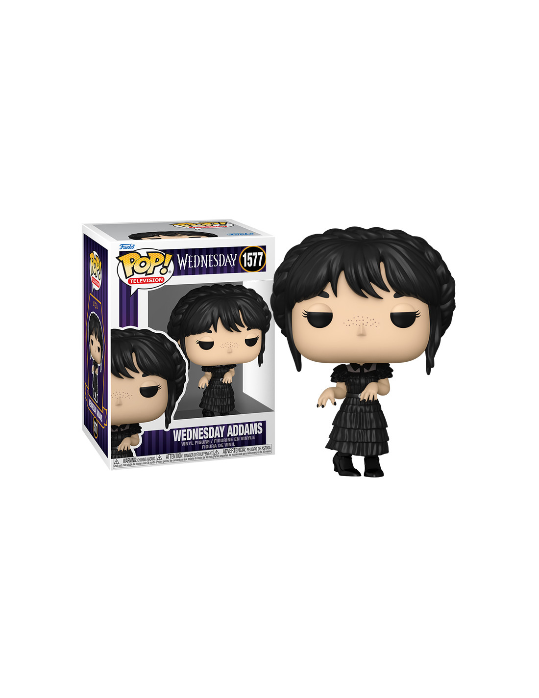 Wednesday - Miercoles Wednesday Addams Dancing (1577). Figura de colección de la marca Funko Pop! · Fabricada en vinilo y con una cabeza de tamaño desproporcionado como principal rasgo distintivo. · Mide unos 9 cm. de altura aproximada. · Se entrega en una caja de cartón y plástico rígido transparente. · Con licencia oficial de WEDNESDAY.