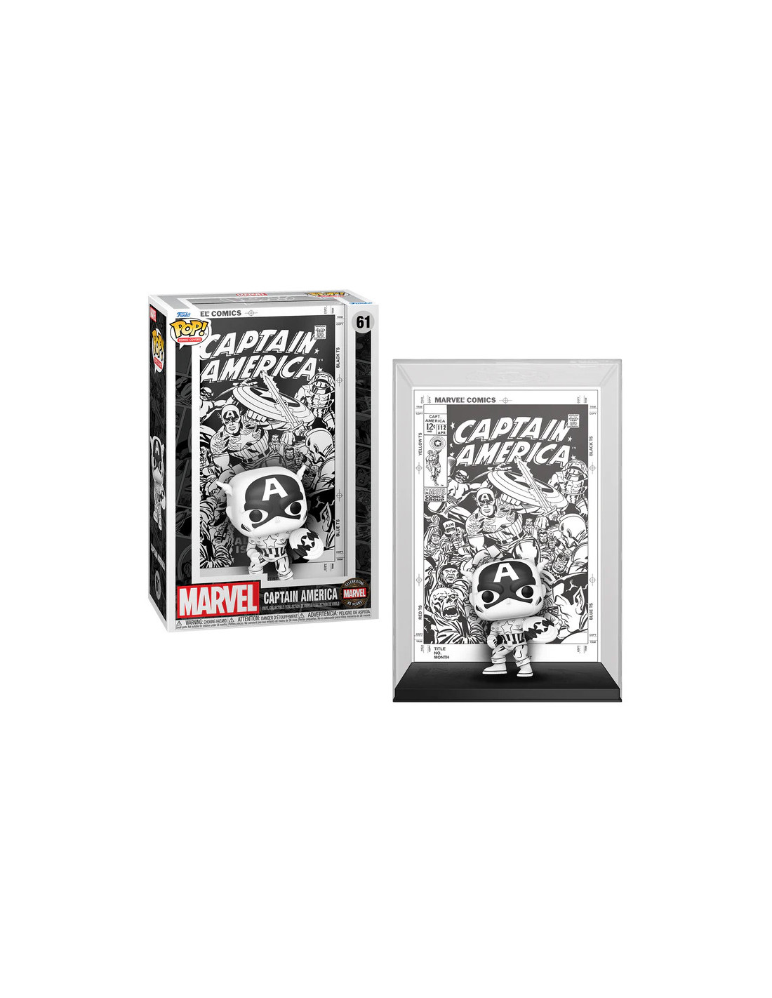 Comic Covers Marvel Captain America (black and white) (61). Figura de colección de la marca Funko Pop! · Fabricada en vinilo y con una cabeza de tamaño desproporcionado como principal rasgo distintivo. · Mide unos 9cm. de altura aproximada. · Se entrega en una caja de cartón y plástico rígido transparente. · Con licencia oficial de MARVEL.