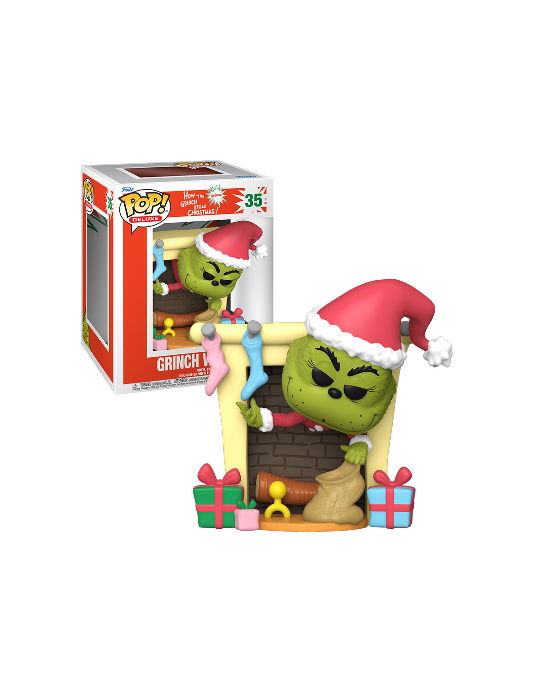 Deluxe Grinch with Bag (35). Figura de colección de la marca Funko Pop! · Fabricada en vinilo y con una cabeza de tamaño desproporcionado como principal rasgo distintivo. · Mide unos 15 cm. de altura aproximada. · Se entrega en una caja de cartón y plástico rígido transparente. · Con licencia oficial de THE GRINCH.