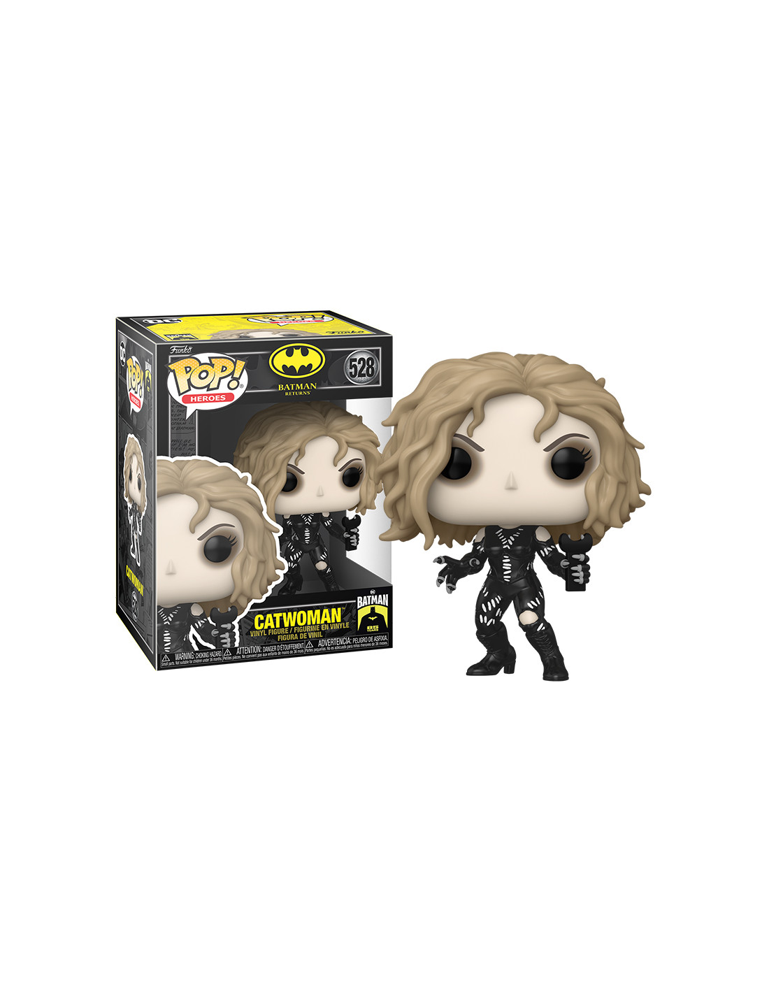 Batman Returns Catwoman (528). Figura de colección de la marca Funko Pop! · Fabricada en vinilo y con una cabeza de tamaño desproporcionado como principal rasgo distintivo. · Mide unos 9cm. de altura aproximada. · Se entrega en una caja de cartón y plástico rígido transparente. · Con licencia oficial de BATMAN.