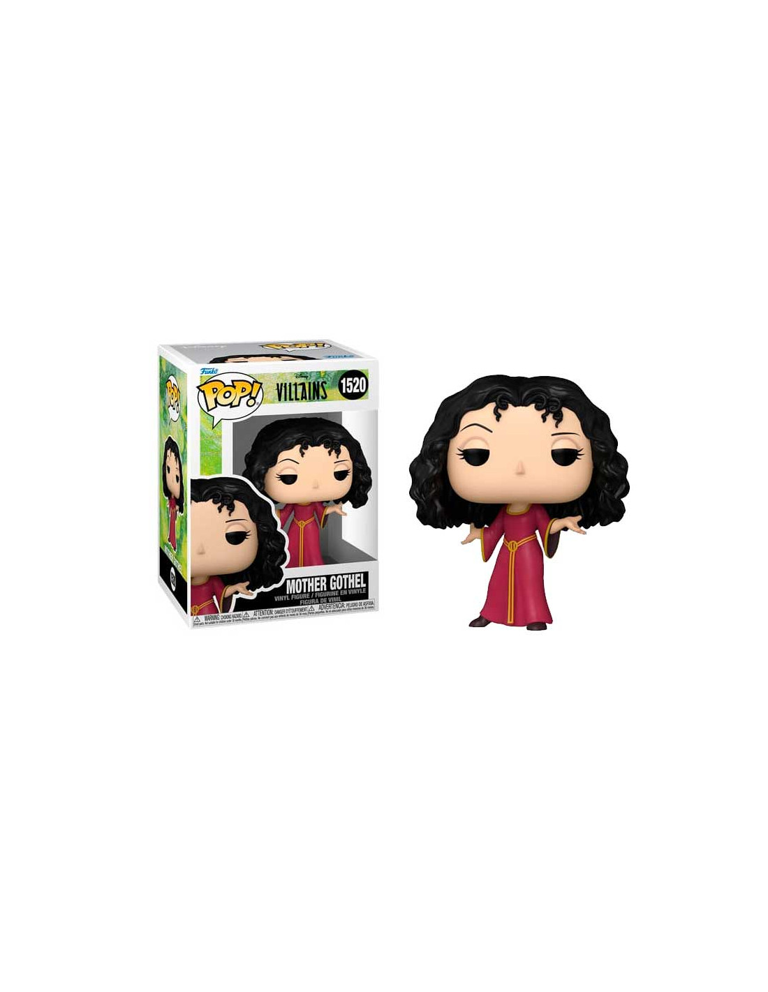 Disney Villains Mother Gothel (1520). Figura de colección de la marca Funko Pop! · Fabricada en vinilo y con una cabeza de tamaño desproporcionado como principal rasgo distintivo. · Mide unos 9cm. de altura aproximada. · Se entrega en una caja de cartón y plástico rígido transparente. · Con licencia oficial de DISNEY VILLAINS.