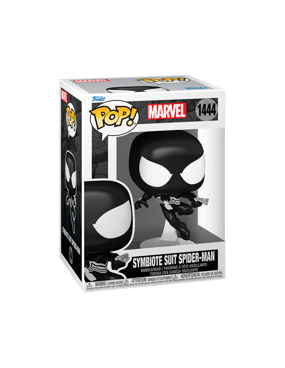 Marvel Spider-Man - Symbiote Suit Spider-Man (1444). Figura de colección de la marca Funko Pop! · Fabricada en vinilo y con una cabeza de tamaño desproporcionado como principal rasgo distintivo. · Mide unos 9cm. de altura aproximada. · Se entrega en una caja de cartón y plástico rígido transparente. · Con licencia oficial de MARVEL.