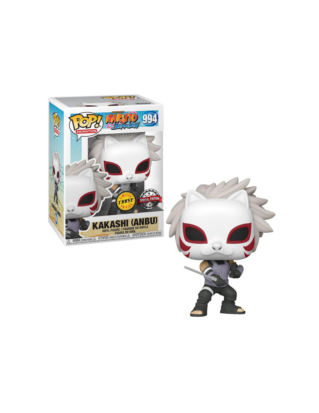 Naruto Shippuden Kakashi (Anbu) CHASE (994). Figura de colección de la marca Funko Pop! · Fabricada en vinilo y con una cabeza de tamaño desproporcionado como principal rasgo distintivo. · Mide unos 9cm. de altura aproximada. · Se entrega en una caja de cartón y plástico rígido transparente. · Con licencia oficial de NARUTO.
