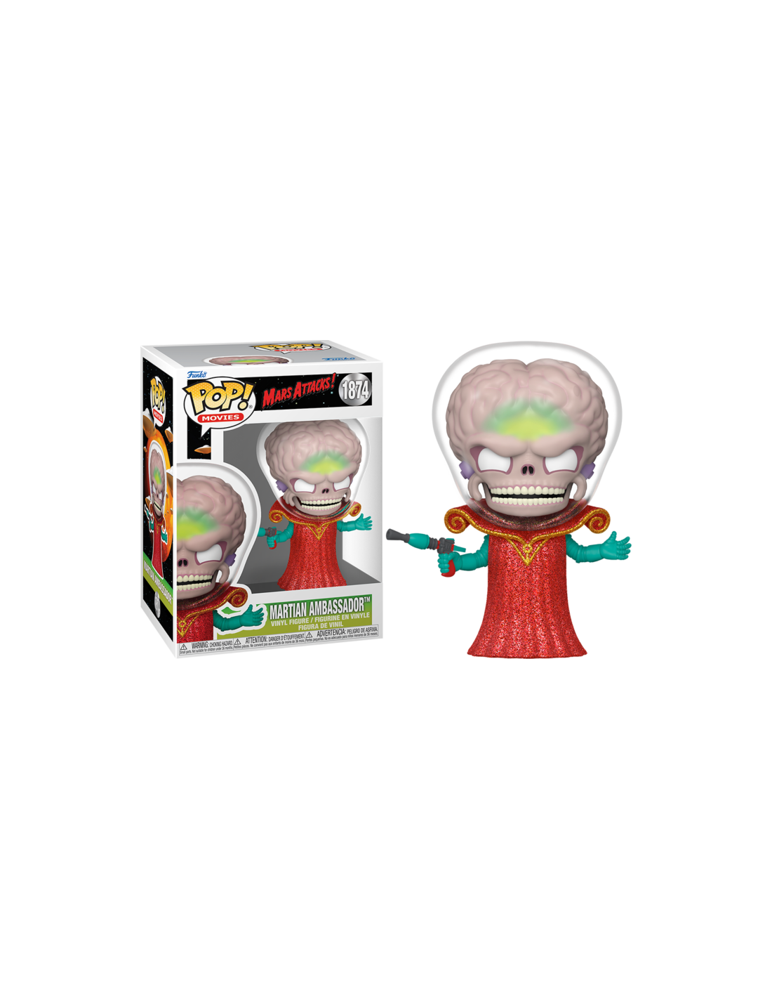 Mars Attacks! Martian Ambassor (1874). Figura de colección de la marca Funko Pop! · Fabricada en vinilo y con una cabeza de tamaño desproporcionado como principal rasgo distintivo. · Mide unos 9cm. de altura aproximada. · Se entrega en una caja de cartón y plástico rígido transparente. · Con licencia oficial de MARS ATTACKS!.