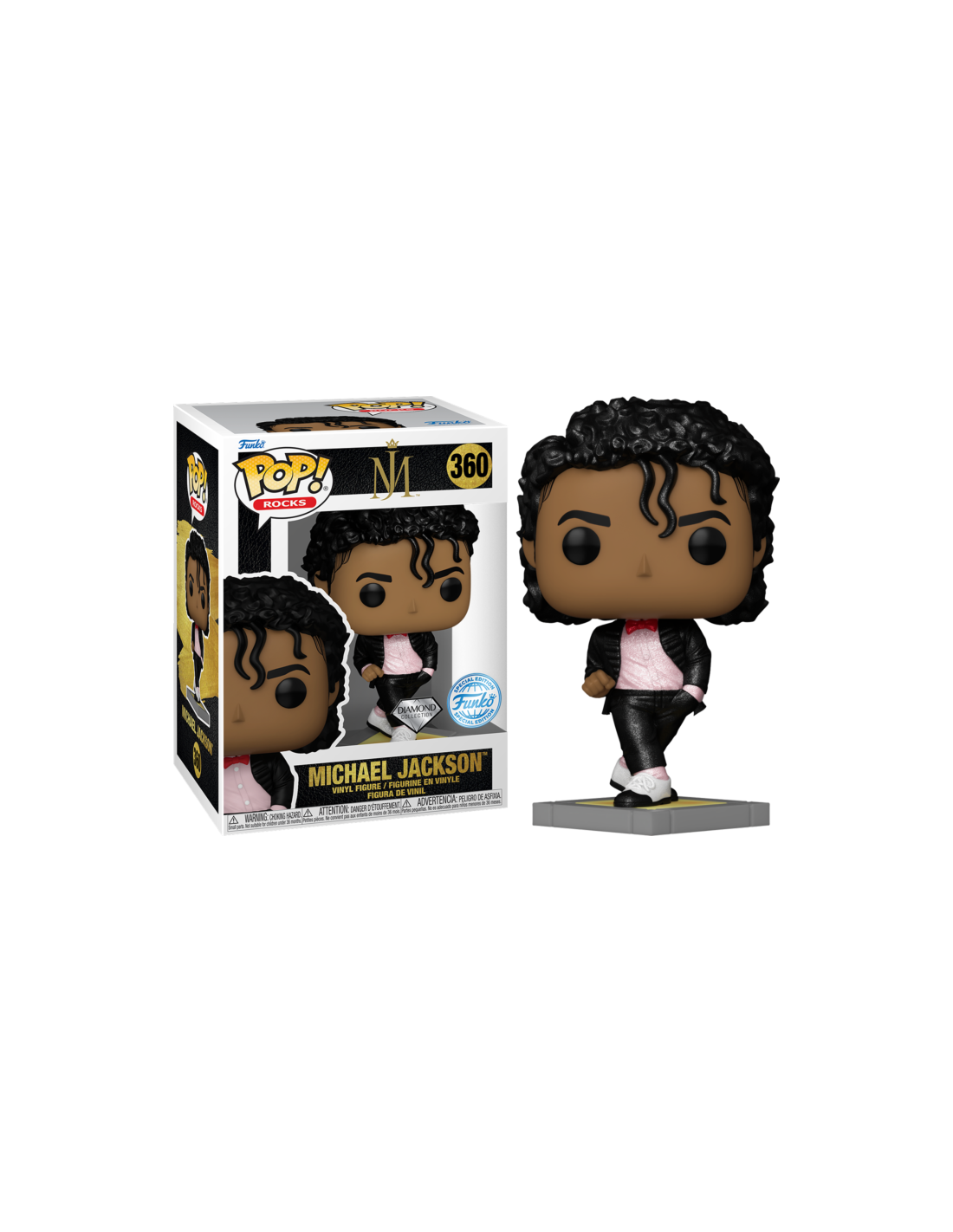 Michael Jackson MJ Billie Jean Diamond Collection Special Edition (360). Figura de colección de la marca Funko Pop! · Fabricada en vinilo y con una cabeza de tamaño desproporcionado como principal rasgo distintivo. · Mide unos 9cm. de altura aproximada. · Se entrega en una caja de cartón y plástico rígido transparente. · Con licencia oficial de MICHAEL JACKSON.