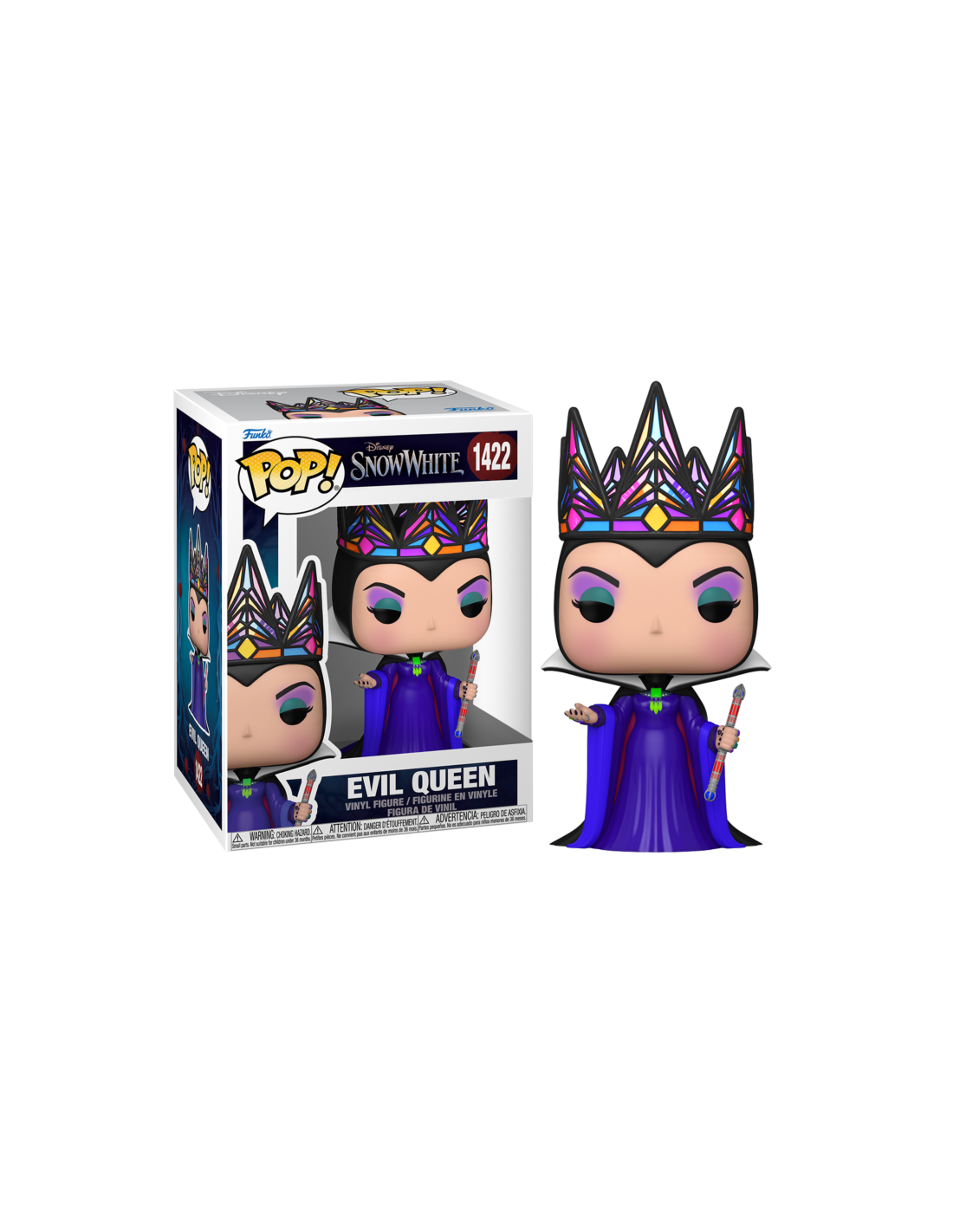 Disney Snow White Blancanieves Evil Queen (Purple & Black Gown) (1422). Figura de colección de la marca Funko Pop! · Fabricada en vinilo y con una cabeza de tamaño desproporcionado como principal rasgo distintivo. · Mide unos 9 cm. de altura aproximada. · Se entrega en una caja de cartón y plástico rígido transparente. · Con licencia oficial de DISNEY.