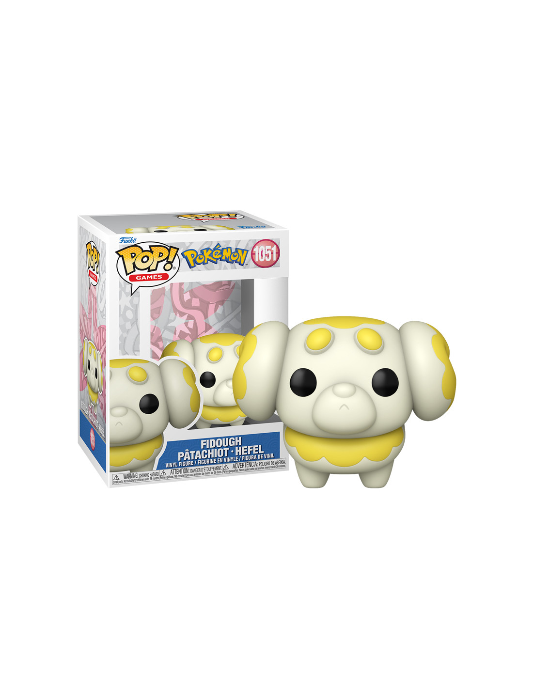 Pokémon Fidough (1051). Figura de colección de la marca Funko Pop! · Fabricada en vinilo y con una cabeza de tamaño desproporcionado como principal rasgo distintivo. · Mide unos 9cm. de altura aproximada. · Se entrega en una caja de cartón y plástico rígido transparente. · Con licencia oficial de POKEMON.