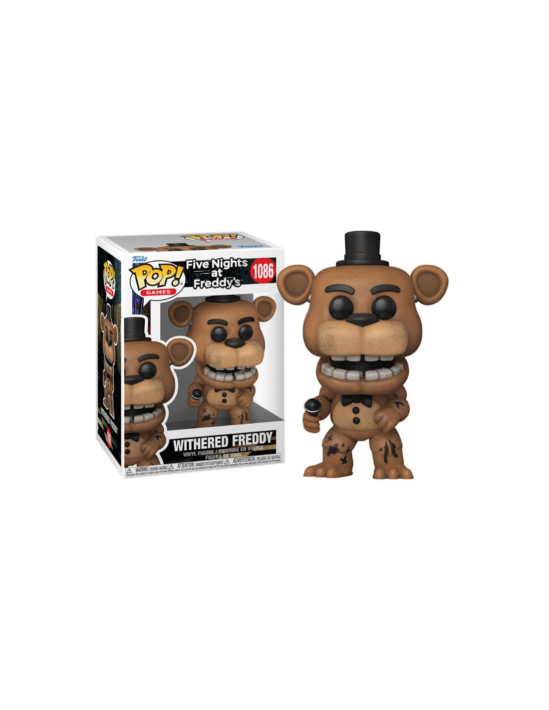 Five Nights at Freddys Withered Freddy (1086). Figura de colección de la marca Funko Pop! · Fabricada en vinilo y con una cabeza de tamaño desproporcionado como principal rasgo distintivo. · Mide unos 9cm. de altura aproximada. · Se entrega en una caja de cartón y plástico rígido transparente. · Con licencia oficial de FIVE NIGHTS AT FREDDYS.