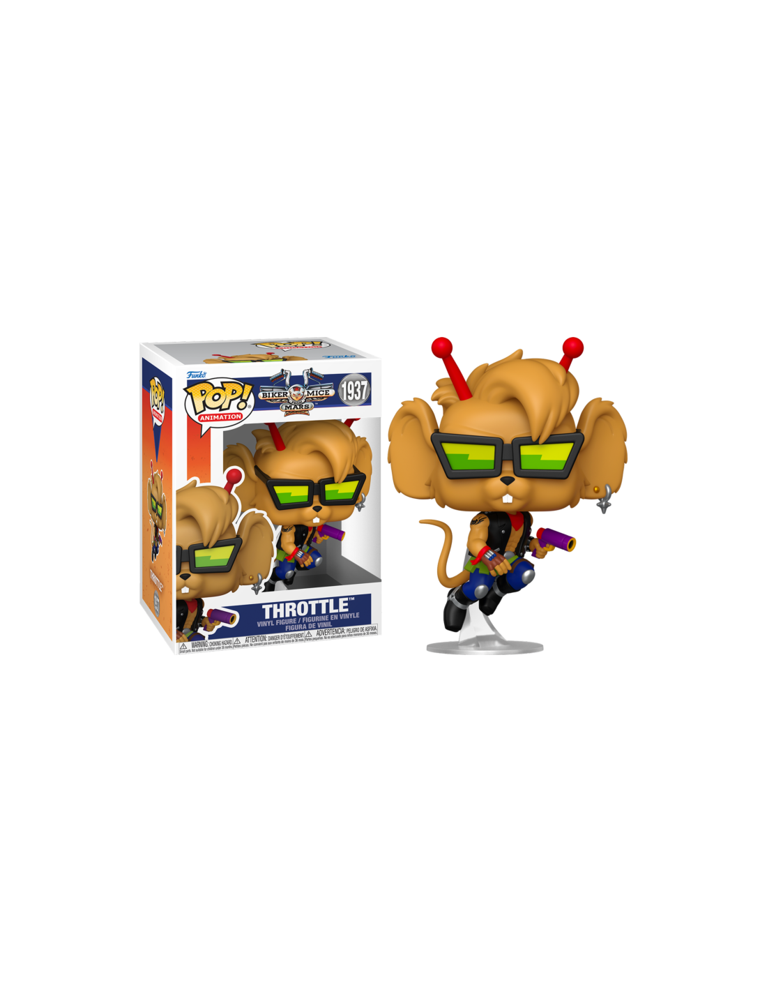 Los Motorratones de Marte (Biker Mice From Mars) Throttle (1937). Figura de colección de la marca Funko Pop! · Fabricada en vinilo y con una cabeza de tamaño desproporcionado como principal rasgo distintivo. · Mide unos 9cm. de altura aproximada. · Se entrega en una caja de cartón y plástico rígido transparente. · Con licencia oficial de LOS MOTORRATONES DE MARTE.