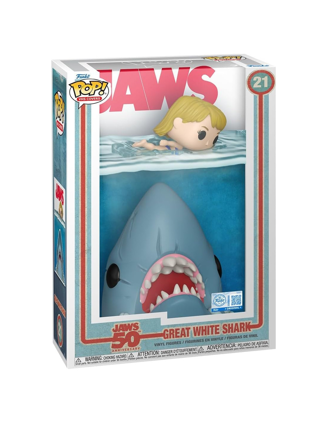 VHS COVERS Tiburón (Jaws 50th Anniversary) Great White Shark (21). Figura de colección de la marca Funko Pop! · Fabricada en vinilo y con una cabeza de tamaño desproporcionado como principal rasgo distintivo. · Mide unos 9cm. de altura aproximada. · Se entrega en una caja de cartón y plástico rígido transparente. · Con licencia oficial de TIBURON.