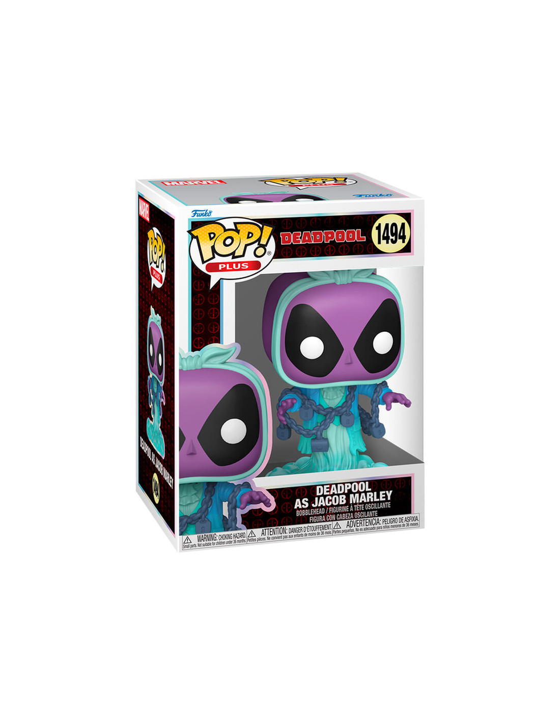 Marvel Deadpool - Deadpool as Jacob Marley (1494). Figura de colección de la marca Funko Pop! · Fabricada en vinilo y con una cabeza de tamaño desproporcionado como principal rasgo distintivo. · Mide unos 9cm. de altura aproximada. · Se entrega en una caja de cartón y plástico rígido transparente. · Con licencia oficial de MARVEL DEADPOOL.