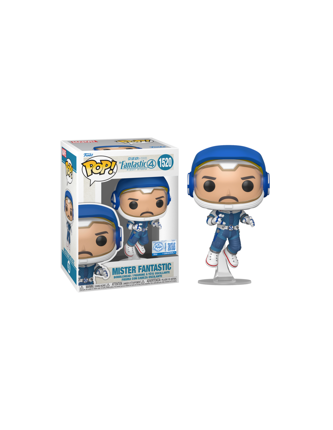 Marvel Los Cuatro Fantásticos Primeros Pasos Mister Fantastic (Astronaut) Special Edition (1520). Figura de colección de la marca Funko Pop! · Fabricada en vinilo y con una cabeza de tamaño desproporcionado como principal rasgo distintivo. · Mide unos 9cm. de altura aproximada. · Se entrega en una caja de cartón y plástico rígido transparente. · Con licencia oficial de MARVEL LOS CUATRO FANTASTICOS.
