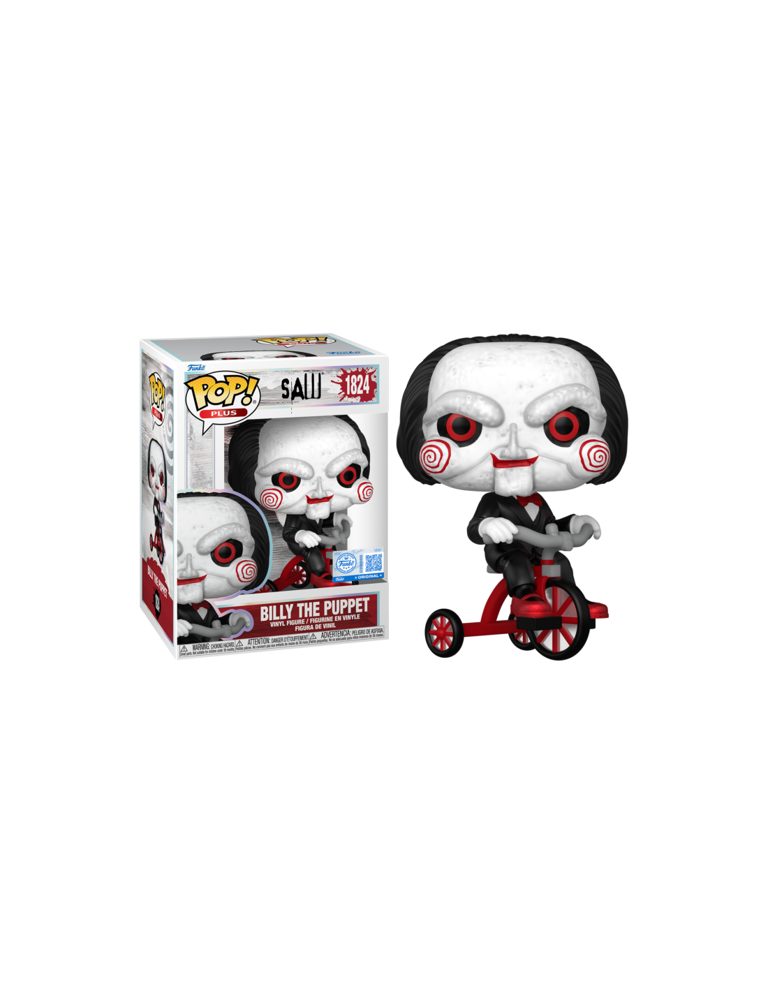Saw Billy on Tricycle Special Edition PLUS (1824). Figura de colección de la marca Funko Pop! · Fabricada en vinilo y con una cabeza de tamaño desproporcionado como principal rasgo distintivo. · Mide unos 9cm. de altura aproximada. · Se entrega en una caja de cartón y plástico rígido transparente. · Con licencia oficial de SAW.