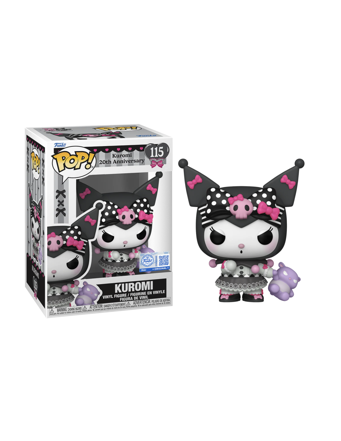 Kuromi 20th Anniversary Kuromi Special Edition (115). Figura de colección de la marca Funko Pop! · Fabricada en vinilo y con una cabeza de tamaño desproporcionado como principal rasgo distintivo. · Mide unos 9cm. de altura aproximada. · Se entrega en una caja de cartón y plástico rígido transparente. · Con licencia oficial de SANRIO KUROMI.
