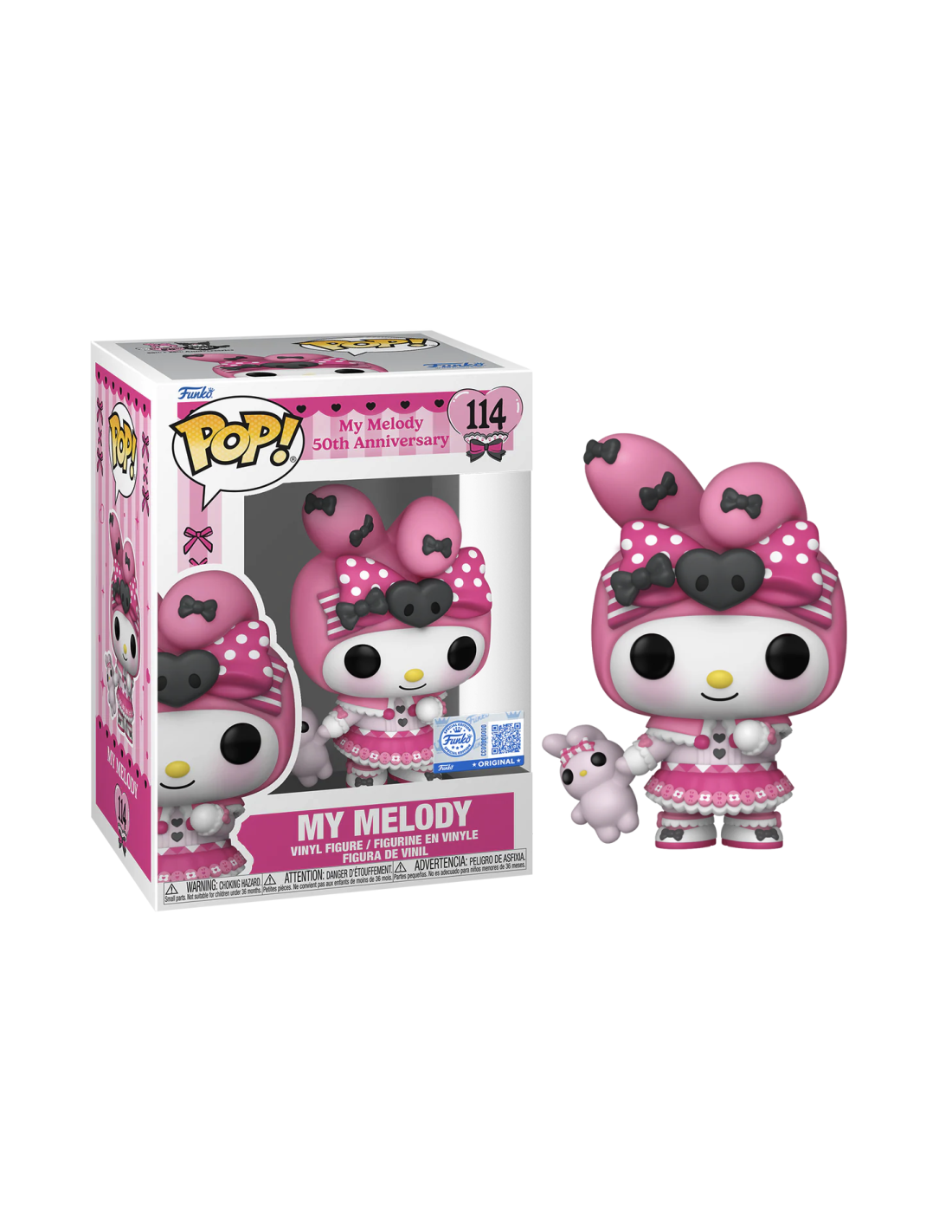 My Melody 20th Anniversary My Melody Special Edition (114). Figura de colección de la marca Funko Pop! · Fabricada en vinilo y con una cabeza de tamaño desproporcionado como principal rasgo distintivo. · Mide unos 9cm. de altura aproximada. · Se entrega en una caja de cartón y plástico rígido transparente. · Con licencia oficial de SANRIO MY MELODY.