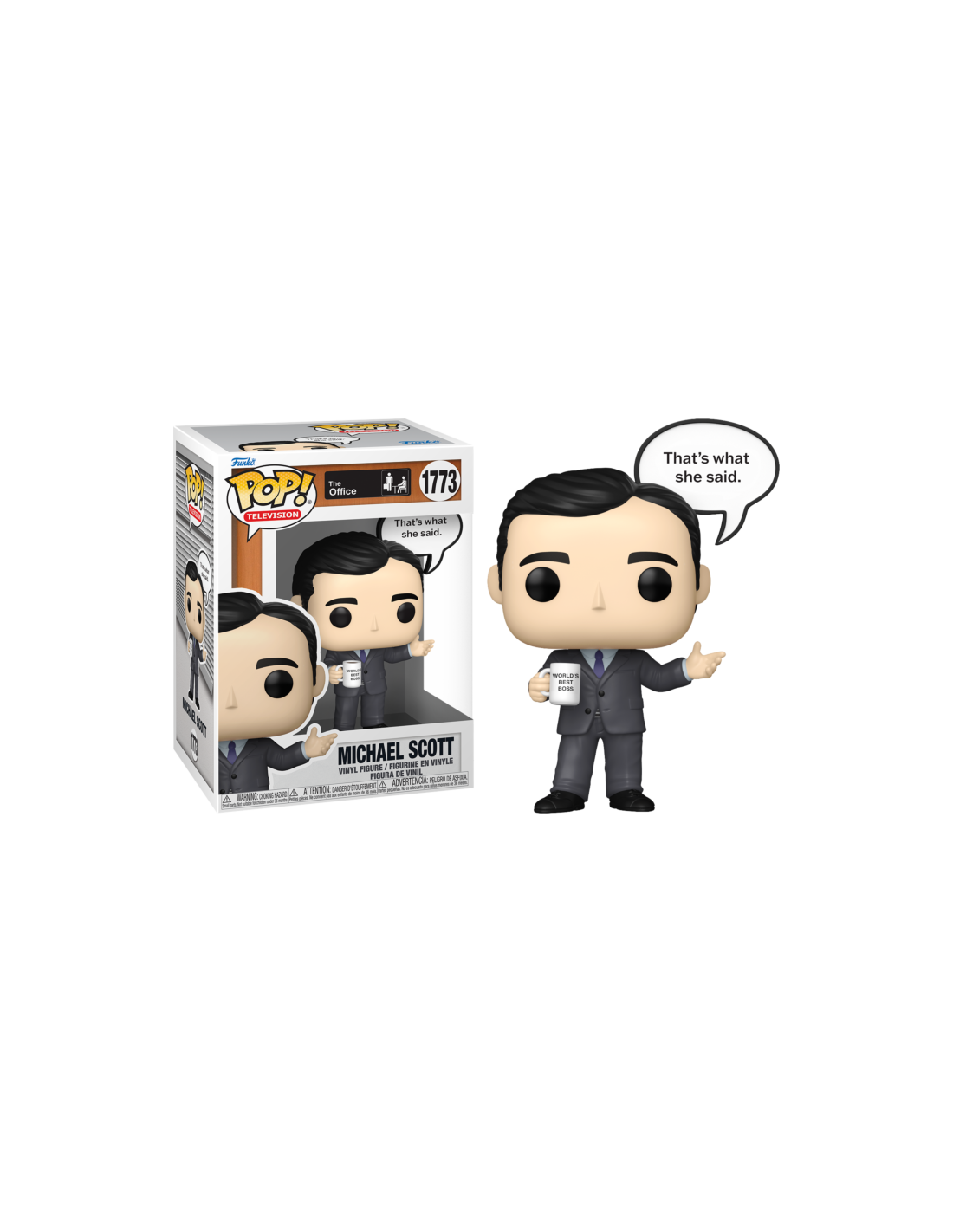 The Office Michael Scott "That's what she said" (1773). Figura de colección de la marca Funko Pop! · Fabricada en vinilo y con una cabeza de tamaño desproporcionado como principal rasgo distintivo. · Mide unos 9 cm. de altura aproximada. · Se entrega en una caja de cartón y plástico rígido transparente. · Con licencia oficial de THE OFFICE.