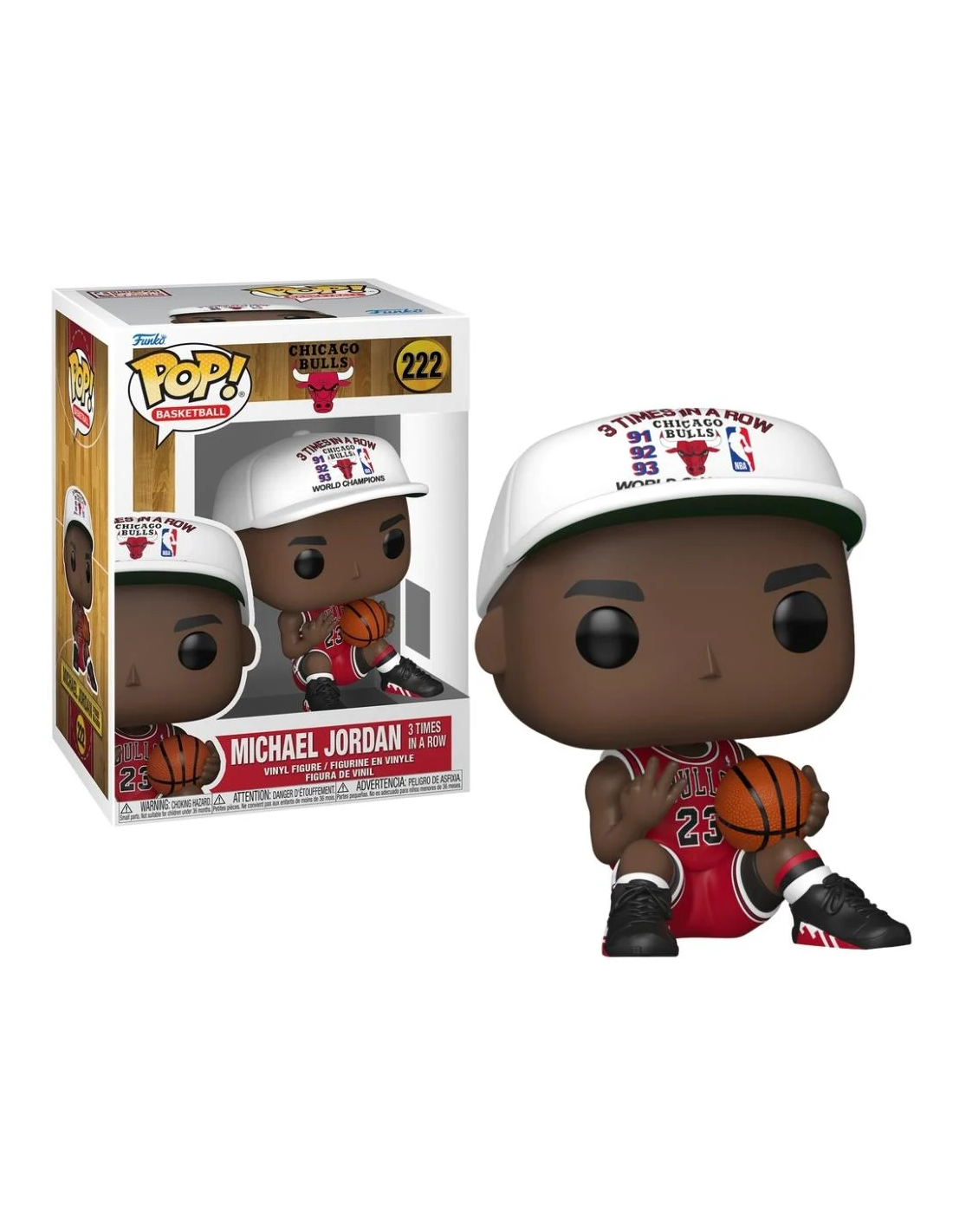 NBA Chicago Bulls Michael Jordan 3 Times in a Row (222). Figura de colección de la marca Funko Pop! · Fabricada en vinilo y con una cabeza de tamaño desproporcionado como principal rasgo distintivo. · Mide unos 9 cm. de altura aproximada. · Se entrega en una caja de cartón y plástico rígido transparente. · Con licencia oficial de NBA.