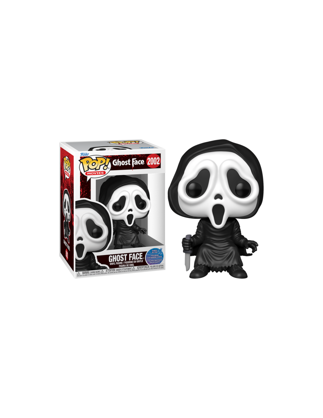 Scream Ghost Face (2002). Figura de colección de la marca Funko Pop! · Fabricada en vinilo y con una cabeza de tamaño desproporcionado como principal rasgo distintivo. · Mide unos 9 cm. de altura aproximada. · Se entrega en una caja de cartón y plástico rígido transparente. · Con licencia oficial de SCREAM.