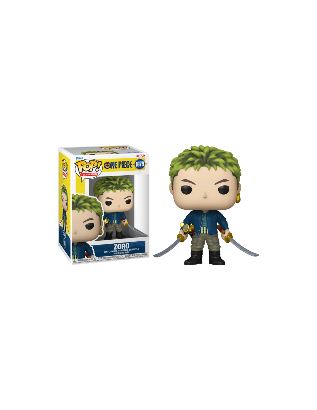 One Piece Zoro (1879). Figura de colección de la marca Funko Pop! · Fabricada en vinilo y con una cabeza de tamaño desproporcionado como principal rasgo distintivo. · Mide unos 9cm. de altura aproximada. · Se entrega en una caja de cartón y plástico rígido transparente. · Con licencia oficial de ONE PIECE.
