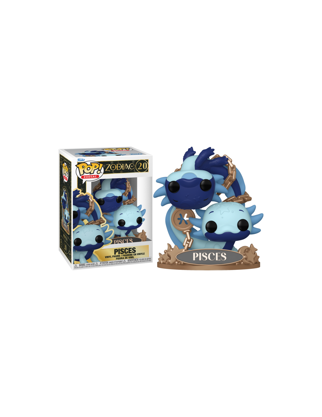 Zodiac Piscis (20). Figura de colección de la marca Funko Pop! · Fabricada en vinilo y con una cabeza de tamaño desproporcionado como principal rasgo distintivo. · Mide unos 9cm. de altura aproximada. · Se entrega en una caja de cartón y plástico rígido transparente. · Con licencia oficial de ZODIAC.