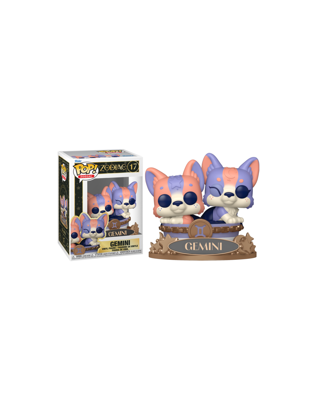 Zodiac Geminis (17). Figura de colección de la marca Funko Pop! · Fabricada en vinilo y con una cabeza de tamaño desproporcionado como principal rasgo distintivo. · Mide unos 9cm. de altura aproximada. · Se entrega en una caja de cartón y plástico rígido transparente. · Con licencia oficial de ZODIAC.