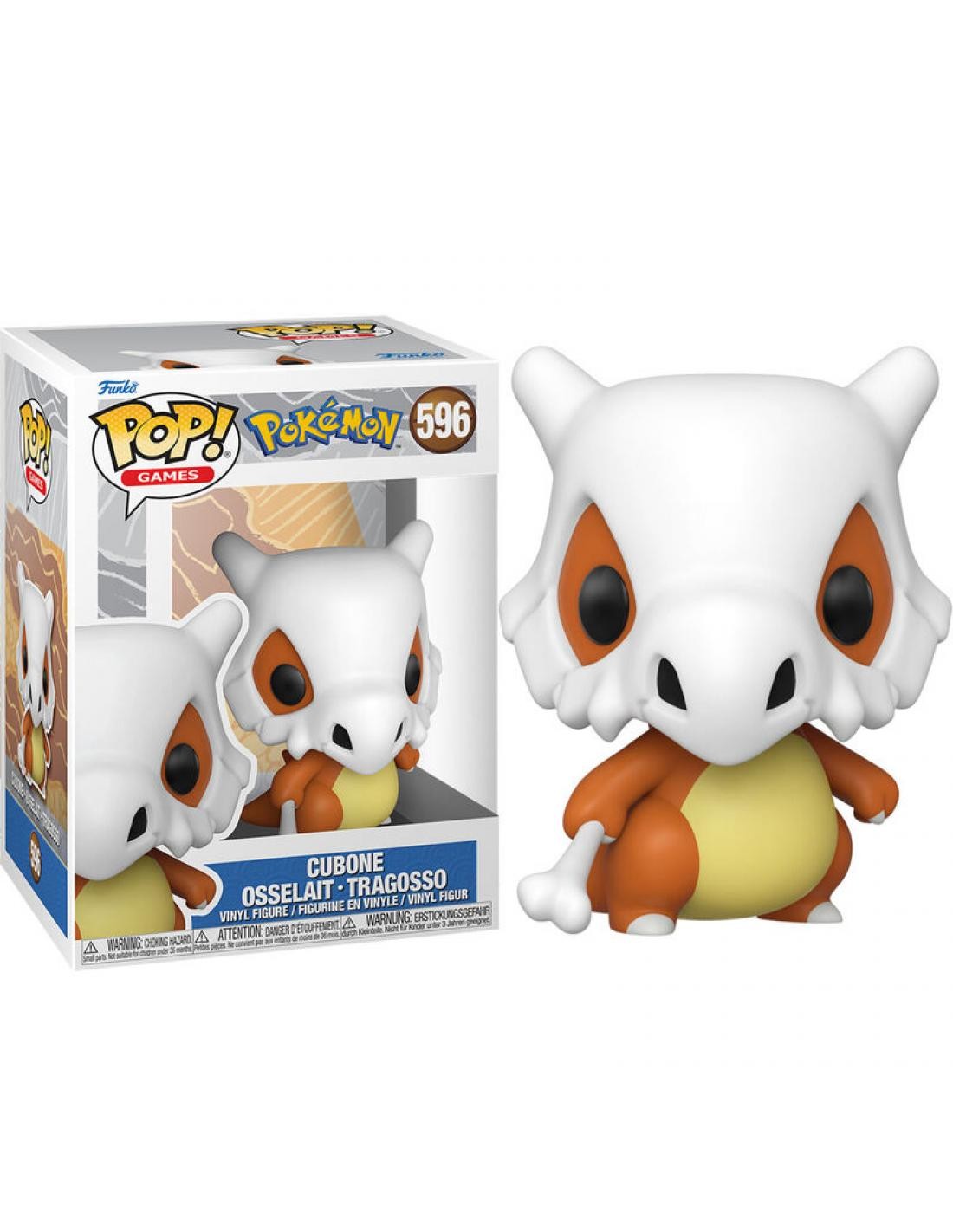 Pokémon Cubone (596). Figura de colección de la marca Funko Pop! · Fabricada en vinilo y con una cabeza de tamaño desproporcionado como principal rasgo distintivo. · Mide unos 9cm. de altura aproximada. · Se entrega en una caja de cartón y plástico rígido transparente. · Con licencia oficial de POKEMON.