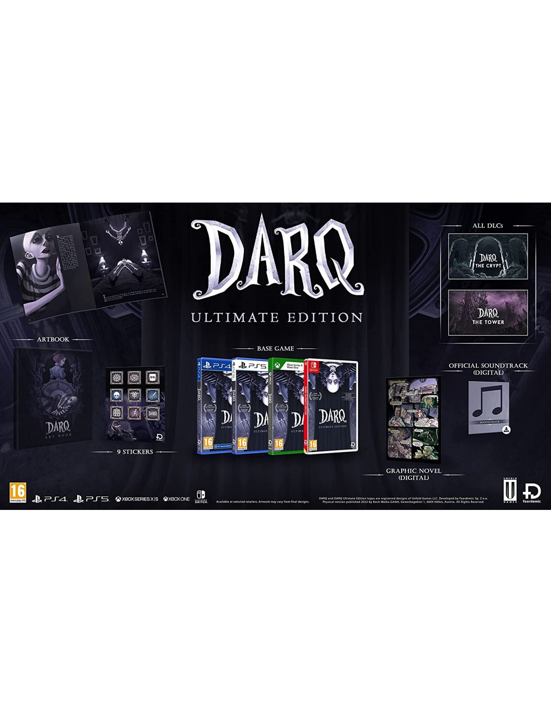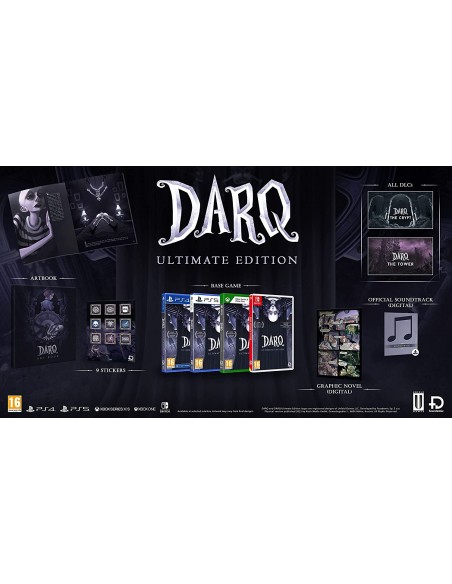 DARQ sigue la historia de un joven llamado Lloyd que se encuentra en una realidad onírica. A medida que viaja por este sueño lúcido, se hace dolorosamente consciente de que los esfuerzos por escapar son inútiles, pero también de que las pesadillas se cuelan en el mundo que atraviesa. Como jugador, intervienes para guiar a Lloyd a través de un mundo en el que no se aplican las leyes tradicionales de la física. Tendrás que aprender y adaptarte al entorno, donde la única constante es ser perseguido. La Ultimate Edition incluye lo siguiente: - El juego base - Los dos DLC (La Cripta y La Torre) - La banda sonora digital - 9 pegatinas personalizadas - Libro de arte de 16 páginas - Novela gráfica digital (DARQ Dream Journal)