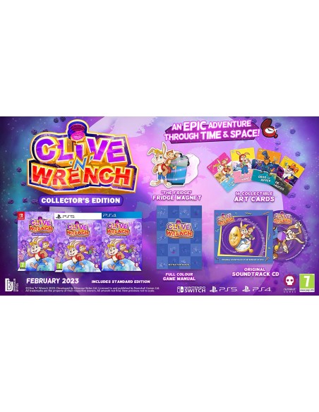 Un cuento ligado al tiempo. Tu aventura te llevará desde la prehistórica edad de hielo de Iceceratops, a atravesar el antiguo Egipto en las Tumbas Tempus, e incluso el camino directo hasta el Salvaje Oeste. ¡Lugares que desafían al espacio! Explora 11 niveles distintos, cada uno con su propio jefe de nivel. Brillantes paraísos de plataformas llenos de desafíos, objetos coleccionables y personajes carismáticos. Fluidez de movimientos. Se han pasado años perfeccionando la sensación y la animación de cada movimiento en el variado conjunto de movimientos de Clive y Wrench, adaptado tanto para jugadores experimentados como para recién llegados. ¡Hecho con pasión! Un proyecto desarrollado únicamente por Rob Wass que comenzó en 2011, Clive 'N' Wrench es un verdadero trabajo de pasión de un genuino fan del género. La edición incluye: -Imán para nevera -Cartas de Arte -Manual -BSO en CD