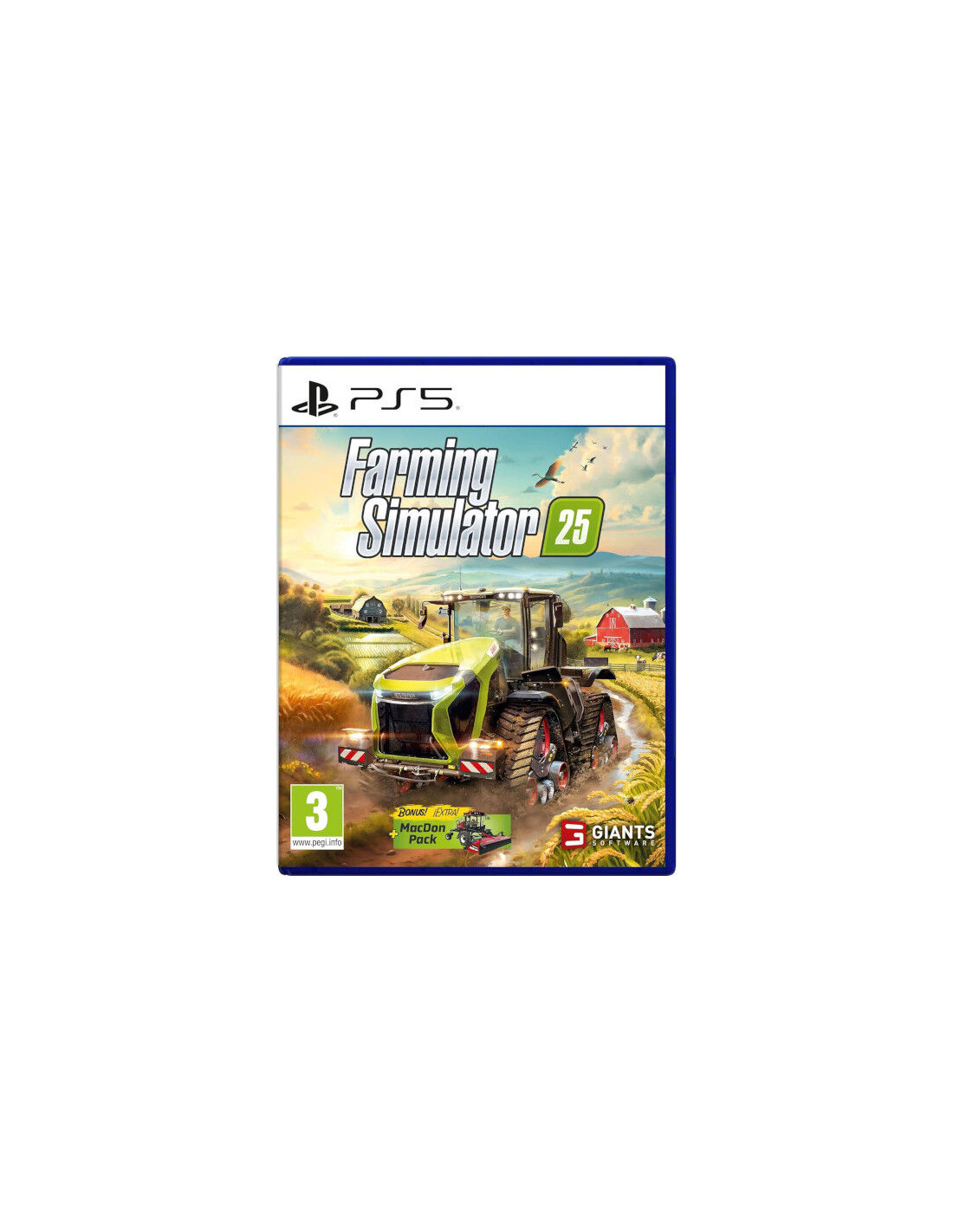 Más jugabilidad: Nuevos cultivos, animales, y otras funciones. Embárcate en una aventura mundial y construye un imperio agrícola en un exuberante paisaje situado en el este asiático repleto de arrozales, un entorno norteamericano con abundantes espacios abiertos o una ubicación centroeuropea con campos verdes entre estanques y ríos. Planta dos tipos de arroz, espinacas y más cultivos nuevos, a elegir entre más de 20 en total. Animales como los fuertes búfalos se unen a las vacas, ovejas, cerdos, pollos, caballos y demás ganado, mientras que las nuevas cadenas de producción y misiones de construcción llegan para ampliar tus oportunidades de negocio. Más máquinas: De marcas internacionales líderes. Más de 400 máquinas y artículos de más de 150 marcas internacionales de primera como Case IH, CLAAS, Fendt, John Deere, Kubota, Massey Ferguson, New Holland, Valtra y muchas más te ayudan en tus tareas de agricultura, silvicultura y ganadería. Tú decides si prefieres construir tu legado en solitario o cooperativamente en modo multijugador. Más inmersión: Mejoras tecnológicas a los campos y efectos visuales. Conecta de manera más profunda con los campos y la naturaleza gracias a una actualización tecnológica general con gráficos y físicas mejorados basada en el último motor Engine 10 de GIANTS apto para mods. Incluye niebla a distancia, sombras mejoradas, efectos climáticos dinámicos, deformación del terreno y mucho más. ¡La romántica vida del agricultor virtual ahora es más inmersiva y envolvente! Contenido adicional de la edición física: -Pack MacDon. ¡MacDon mejora tus cosechas con cinco máquinas destacadas incluidas en el MacDon Pack para Farming Simulator 25! Hazte con la hileradora M1240, los cabezales DX140 y FD140, el cabezal de remolque PW8 y el cabezal de discos R216Sp del fabricante canadiense de equipos de cosecha.