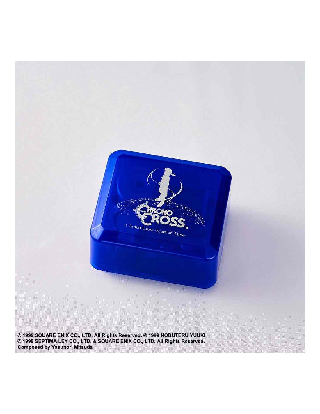 Square Enix presenta una seleccion de cajas de música con algunos de los temas más icónicos del viddeojuego Chrono Cross. En este caso se trata de "Scars of Time" y la caja es de color azul.