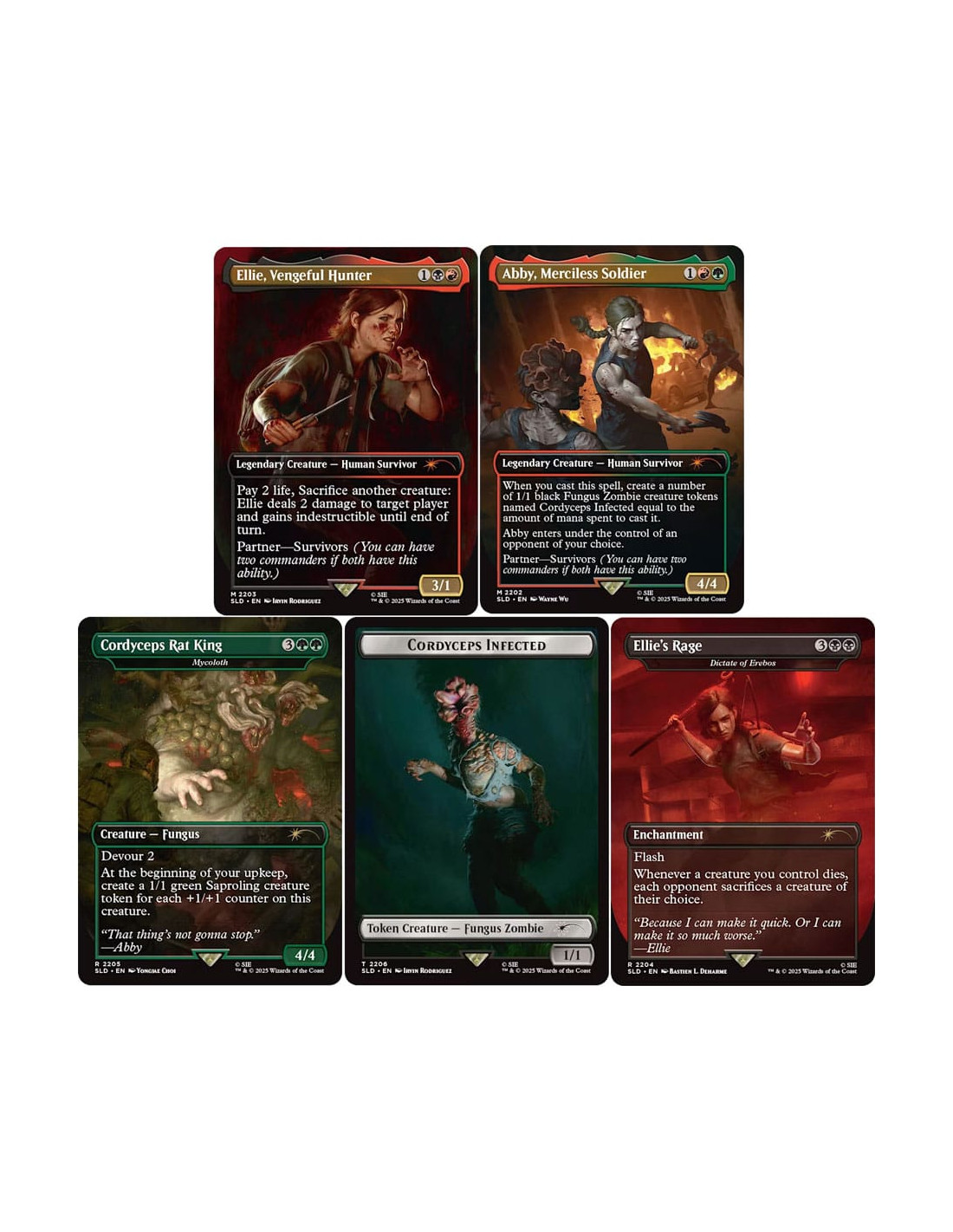 Contenido: 1x Abby, Merciless Soldier 1x Ellie, Vengeful Hunter 1x Dictate of Erebos as "Ellie's Rage" 1x Mycoloth as "Cordyceps Rat King" 1x Cordyceps Infected token