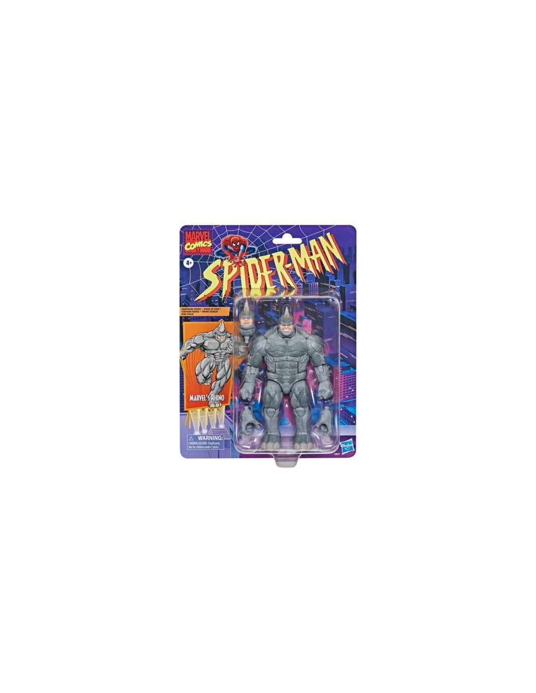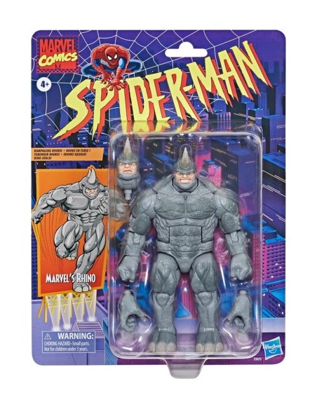 Rhino, el antiguo soldado de la mafia rusa, posee una fuerza inmensa, una exoarmadura casi impenetrable y un rencor obstinado contra Spiderman DISEÑO INSPIRADO: Esta figura de Rhino cuenta con una textura y una decoración inspiradas en las apariciones clásicas del personaje e incluye manos alternativas y una cabeza alternativa que hace muecas. FIGURA ARTICULADA: La figura de Rhino mide 15 cm y presenta una articulación extensiva, que permite colocar la figura en poses dinámicas con otras figuras de la línea Marvel Legends EMBALAJE RETRO: Incluye embalaje con estilo retro, basado en los diseños de Toy Biz de Marvel