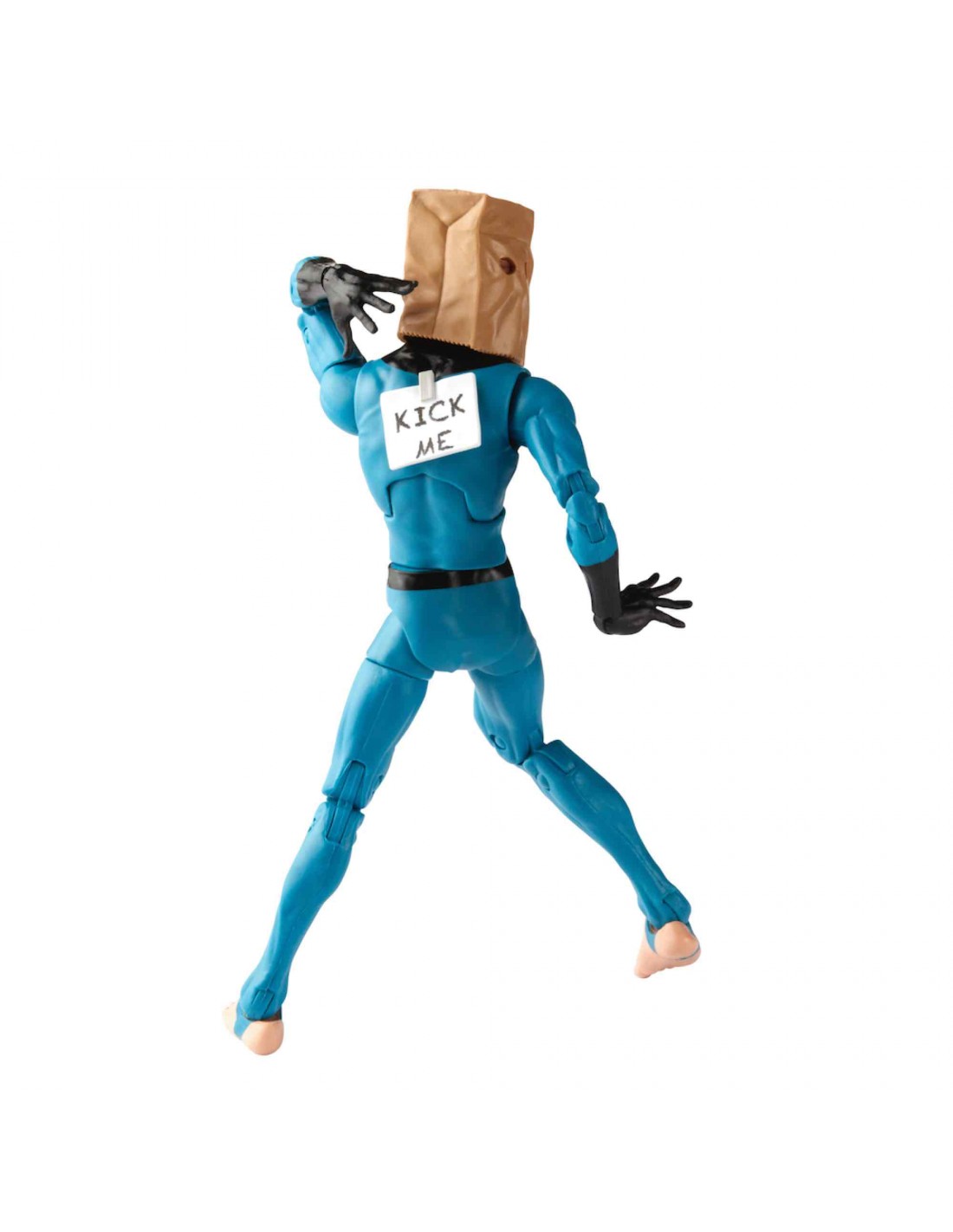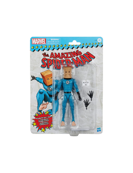 Hasbro Fans presenta dentro de la colección Marvel Series esta figura de el Asombroso Hombre Bolsa. Al quedarse sin traje, Peter Parker se pone un uniforme prestado de los Cuatro Fantásticos y una bolsa de papel. Se trata de una figura articulada de 15 cm, hecha en PVC. La figura viene con manos intercambiables y un cartel removible que dice "kick me!"