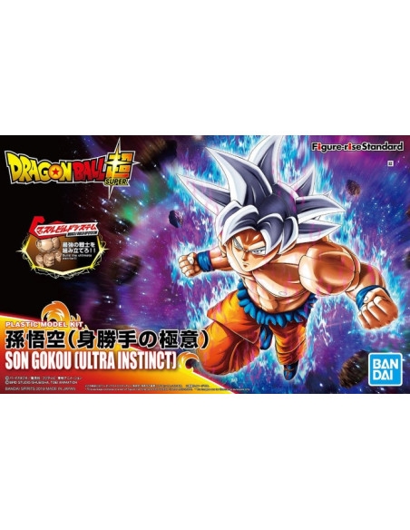 Bandai Hobby presenta dentro de la colección Figure-rise Standard el model kit para montar la figura articulada de Son Goku Ultra Instinct de la popular serie "Dragon Ball Super". Este model kit puede ensamblarse sin necesidad de pegamento e incluye manos alternativas y efectos como complementos.