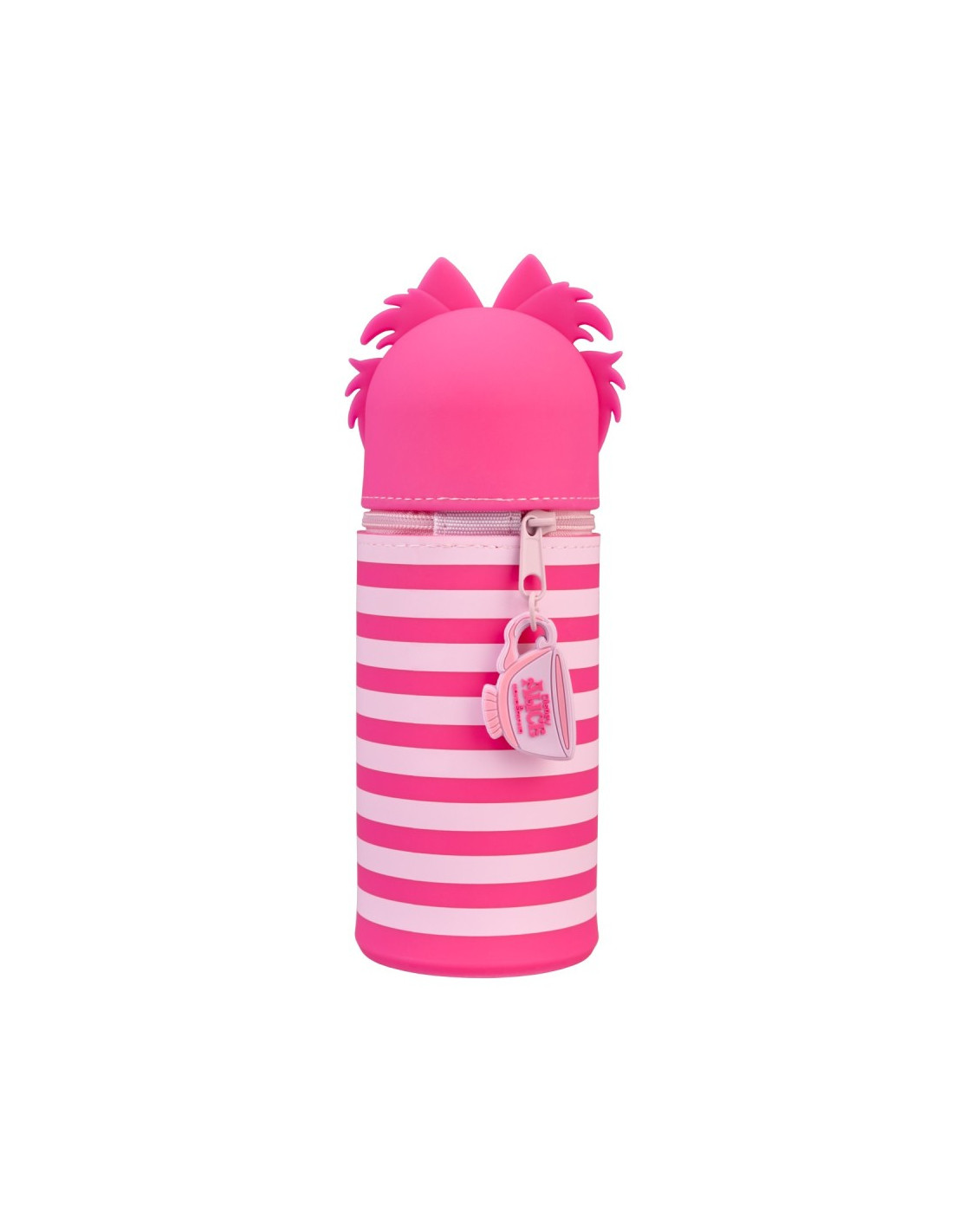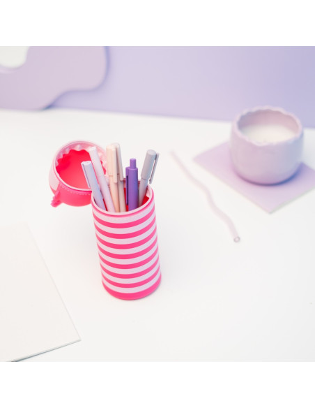 Está fabricado en silicona y tiene cierre de cremallera. Mide 6,5 x 17 cm aunque, el tamaño se puede incrementar, ya que es extensible por su parte inferior.